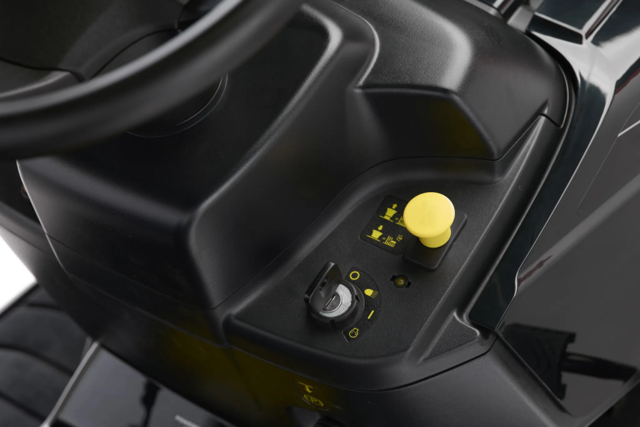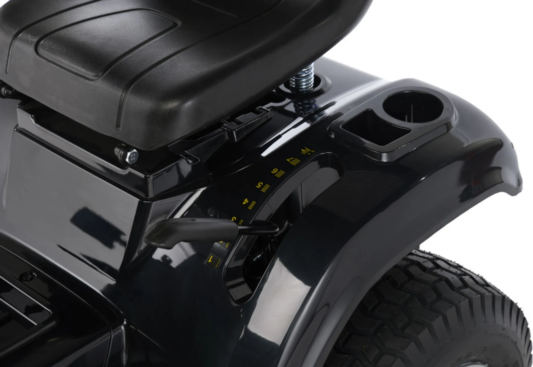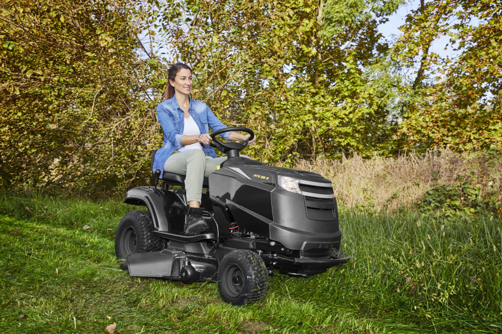 - Zweimesser-Mähwerk mit elektromagnetischer Kupplung und 98 cm Schnittbreite, zentrale Schnitthöhenverstellung mit 7 Stufen, von 25 bis 80 mm, manuelle Schaltung mit 5 Vorwärtsgängen und 1 Rückwärtsgang, Seitenauswurf und optionale Mulchfunktion, Wasseranschluss zur Reinigung des Mähraumes, Scheinwerfer