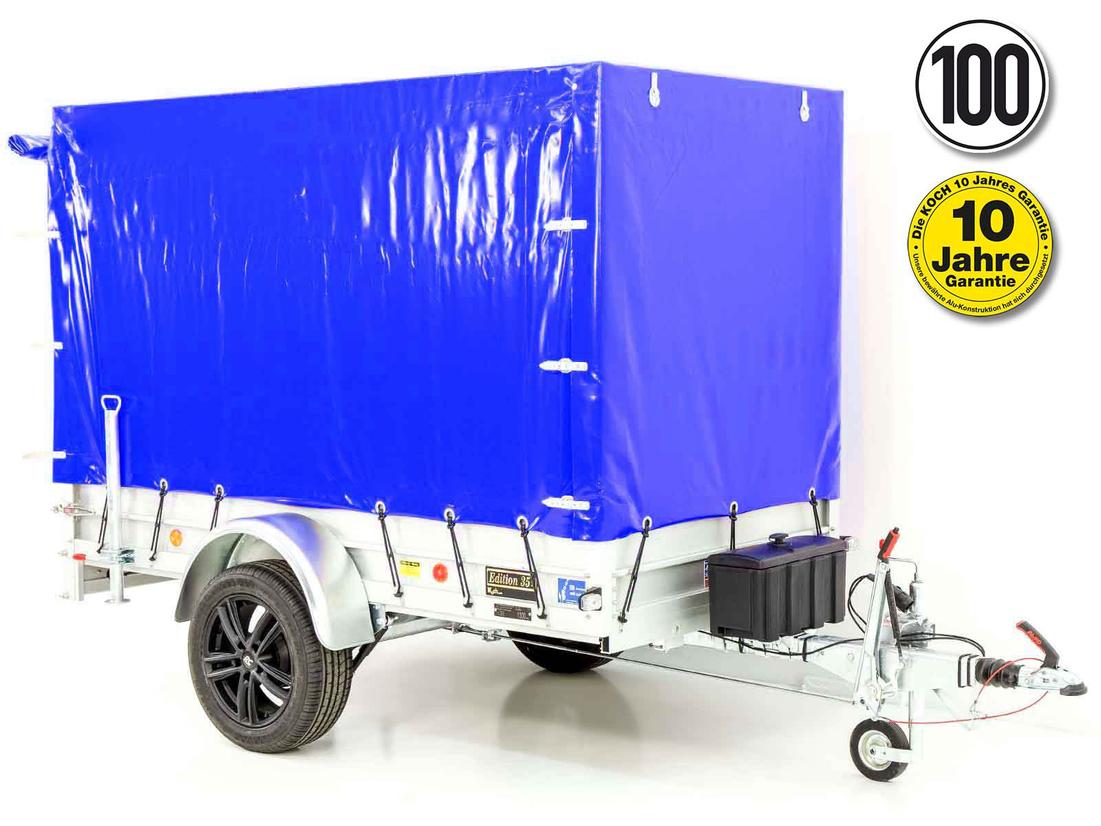 Der -Anhänger „Edition 35“ in blau mit einer 160 cm hohen Plane bietet eine hohe Ladekapazität und eine stabile Bauweise. Mit dem robusten Aluminiumrahmen und der großen Bereifung eignet sich dieser Anhänger hervorragend für den Transport von verschiedenen Gütern.