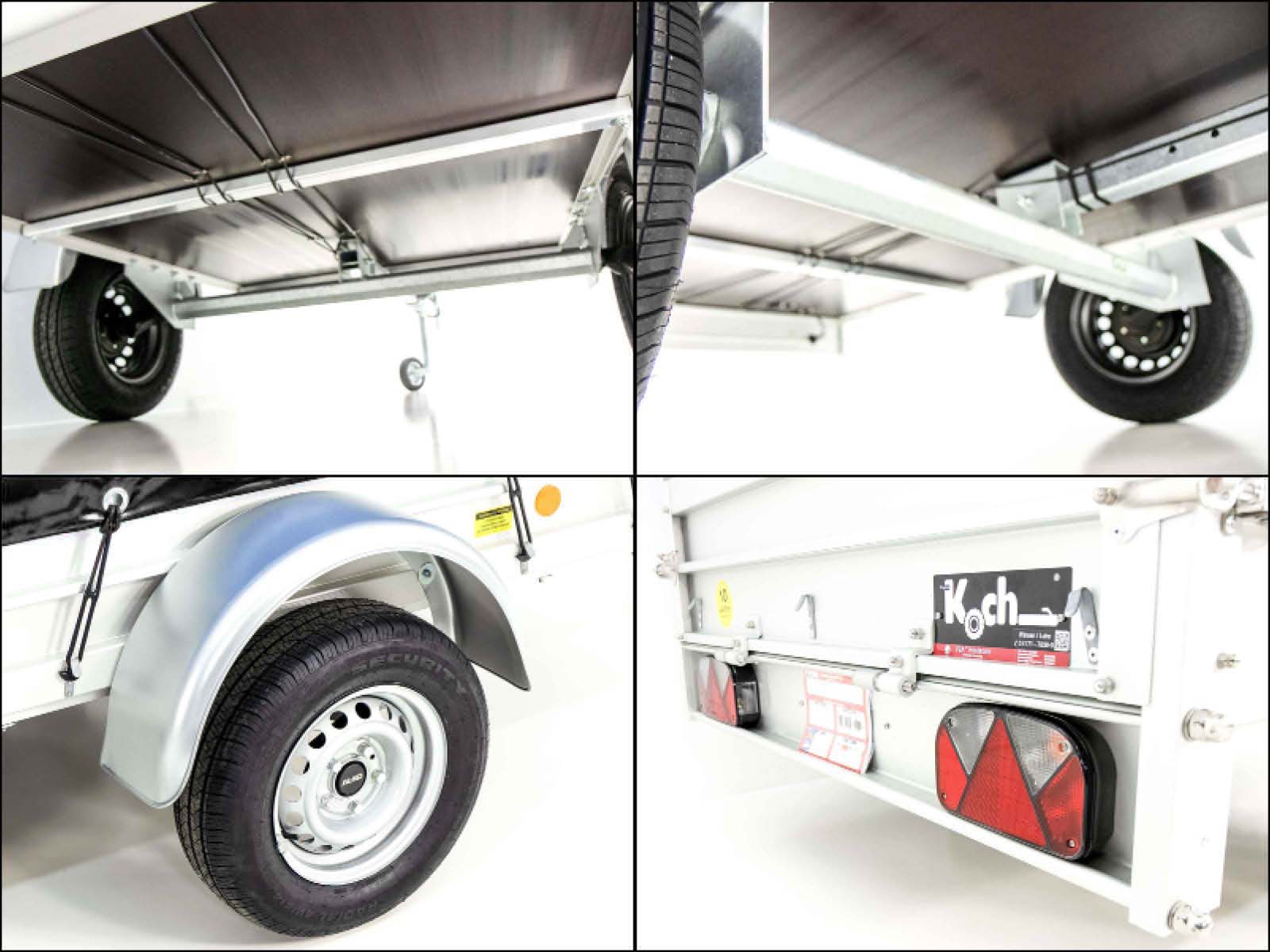 Wie bei den anderen Modellen hat dieser Anhänger eine feuerverzinkte Achse und ein wartungsfreies Achsensystem. Außerdem wird der Anhänger mit einer 12-Volt Elektrik ausgestattet, die für eine sichere Beleuchtung sorgt. Der Anhänger ist ungebremst und eignet sich gut für leichtere Transportaufgaben.