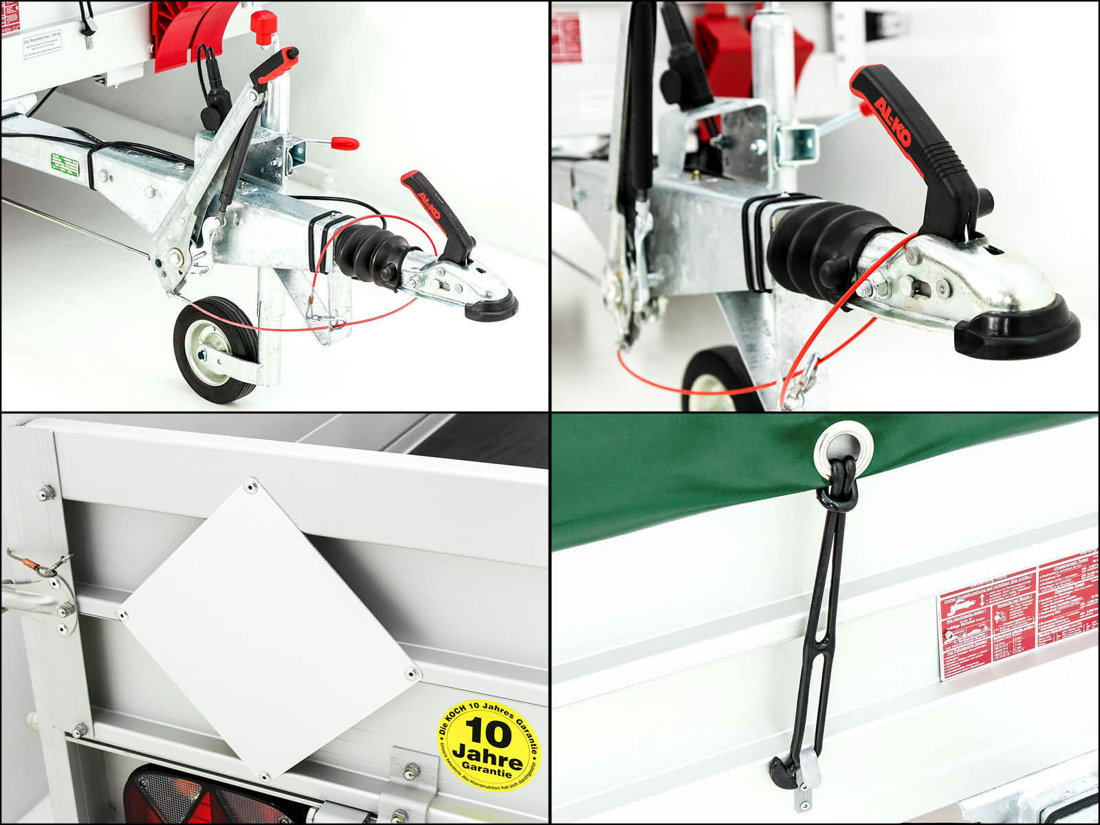 Der Anhänger Typ 7.13 in Grün bietet eine Nutzlast von 1020 kg und ein zulässiges Gesamtgewicht von 1300 kg. Dieser Anhänger ist leicht, robust und besonders für den Transport von mittleren Lasten geeignet. Er ist mit einer hochwertigen Aluminium-Bordwand und einem Ladungssicherungssystem aus Edelstahl ausgestattet. Weitere Merkmale: