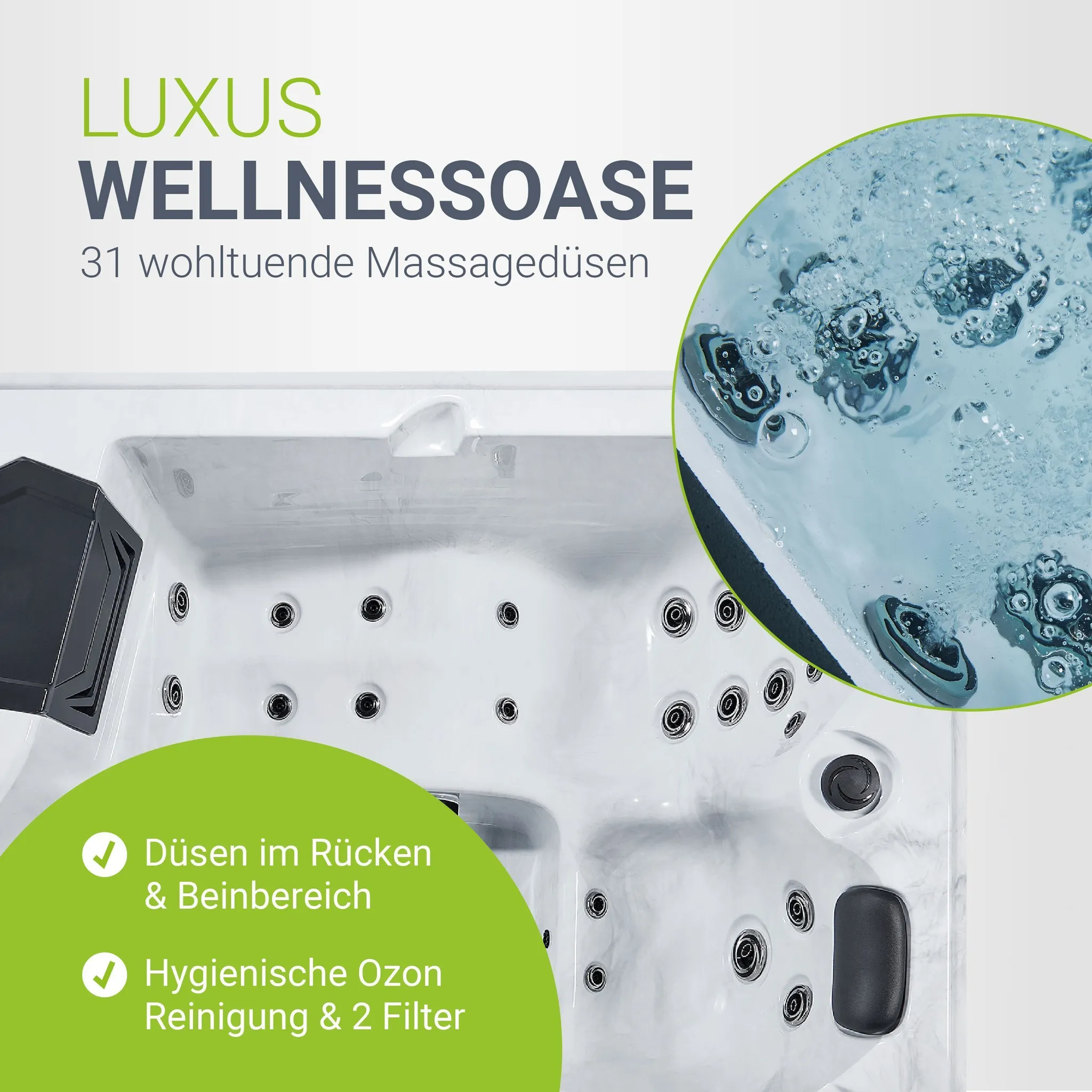 Verwandeln mit unserem beheizten Whirlpool Oasis für bis zu 3 Personen euren Außenbereich in eine eigene Wellnessoase. Insgesamt 31 Massagedüsen, farbige LED Beleuchtung und komfortable Nackenkissen bieten unvergessliche Augenblicke voller Ruhe und Erholsamkeit. Eine effiziente Heizung sorgt für wohlig warmes Wasser. Der Außen-Spa überzeugt außerdem durch eine integrierte Gefrierschutzfunktion, die dich mittels weiterer Frostschutzmaßnahmen vor Beschädigung schützt. Über das moderne Soft-Touch Bedienpanel können sowohl Temperatur, Massage Düsen und LED Beleuchtung intuitiv und individuell von Ihnen gesteuert werden. Finde einfach den geeigneten Platz im Garten oder auf der Terrasse und genieße den neuen Whirlpool.