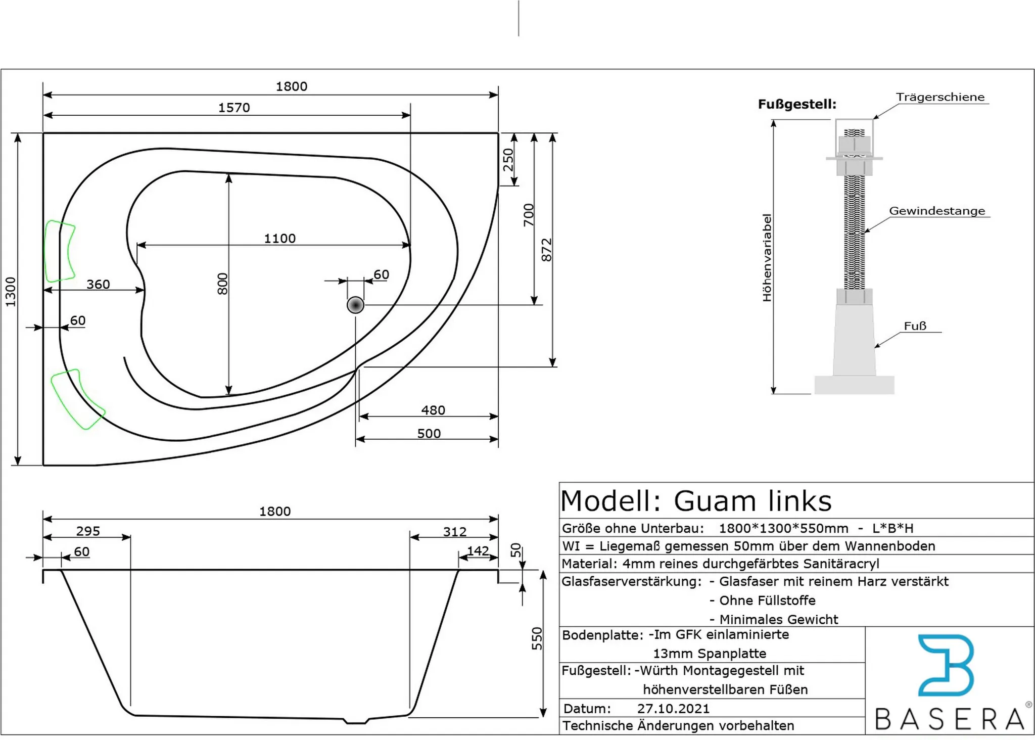 Basera PREMIUM Indoor Eck-Whirlpool Badewanne Guam Links 180 x 130 cm für 2 Personen mit 25 Massagedüsen, Heizung, Ozongenerator, Wasserfall, LED-Ambiente, Touchpanel, Bluetooth, Radio
