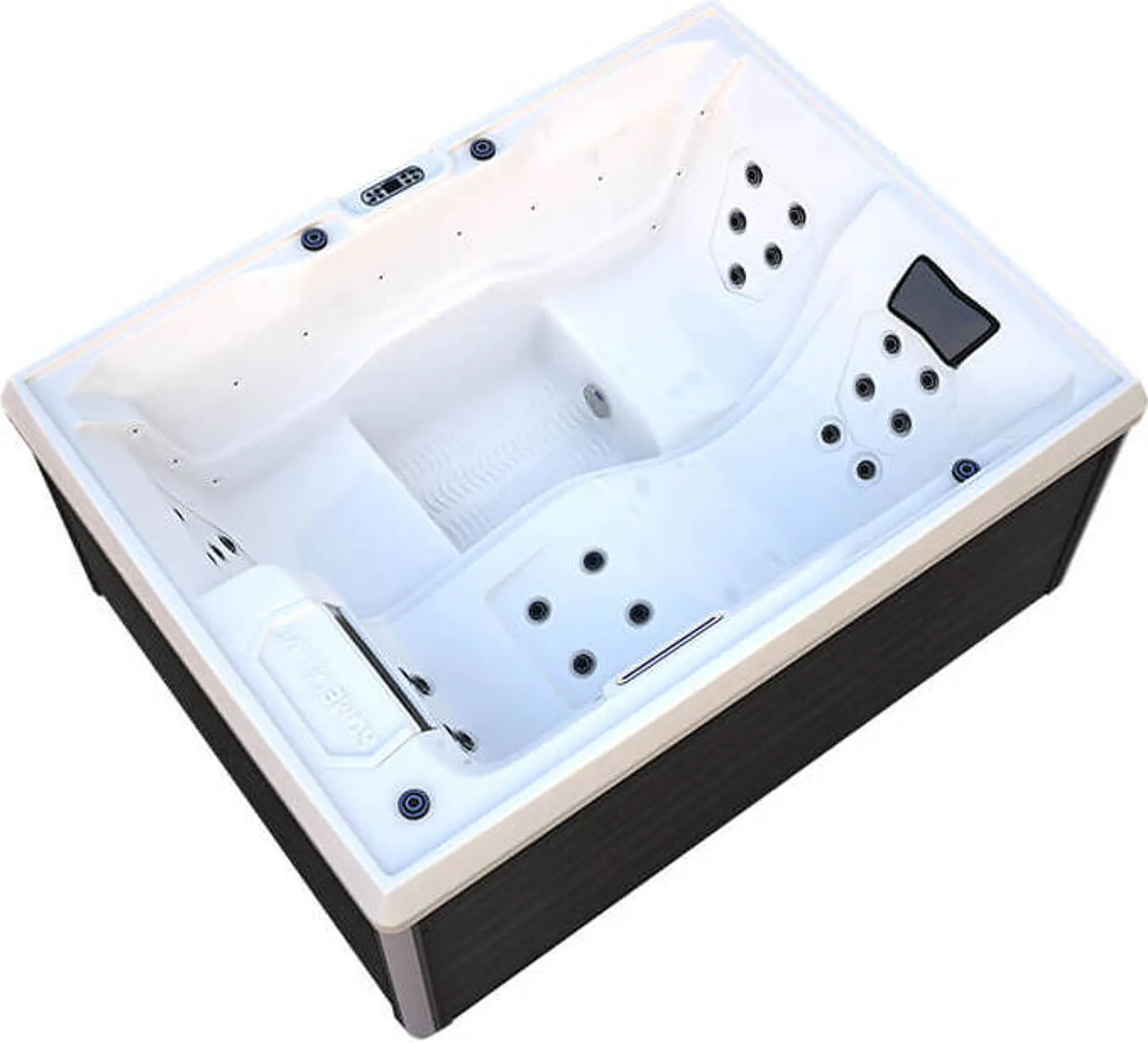 Dank der Leichtbauweise ist der Whirlpool Guam perfekt für den Innenbereich geeignet. Seine Rückenschrägen und die gepolsterten Kopfstützen sorgen für eine komfortable Sitzposition. Die dreieckige Raumsparwanne ist mit 25 leistungsstarken Massagedüsen ausgestattet, welche sich in 5 Seitendüsen, 12 Bodendüsen und 8 Rückendüsen aufteilen.