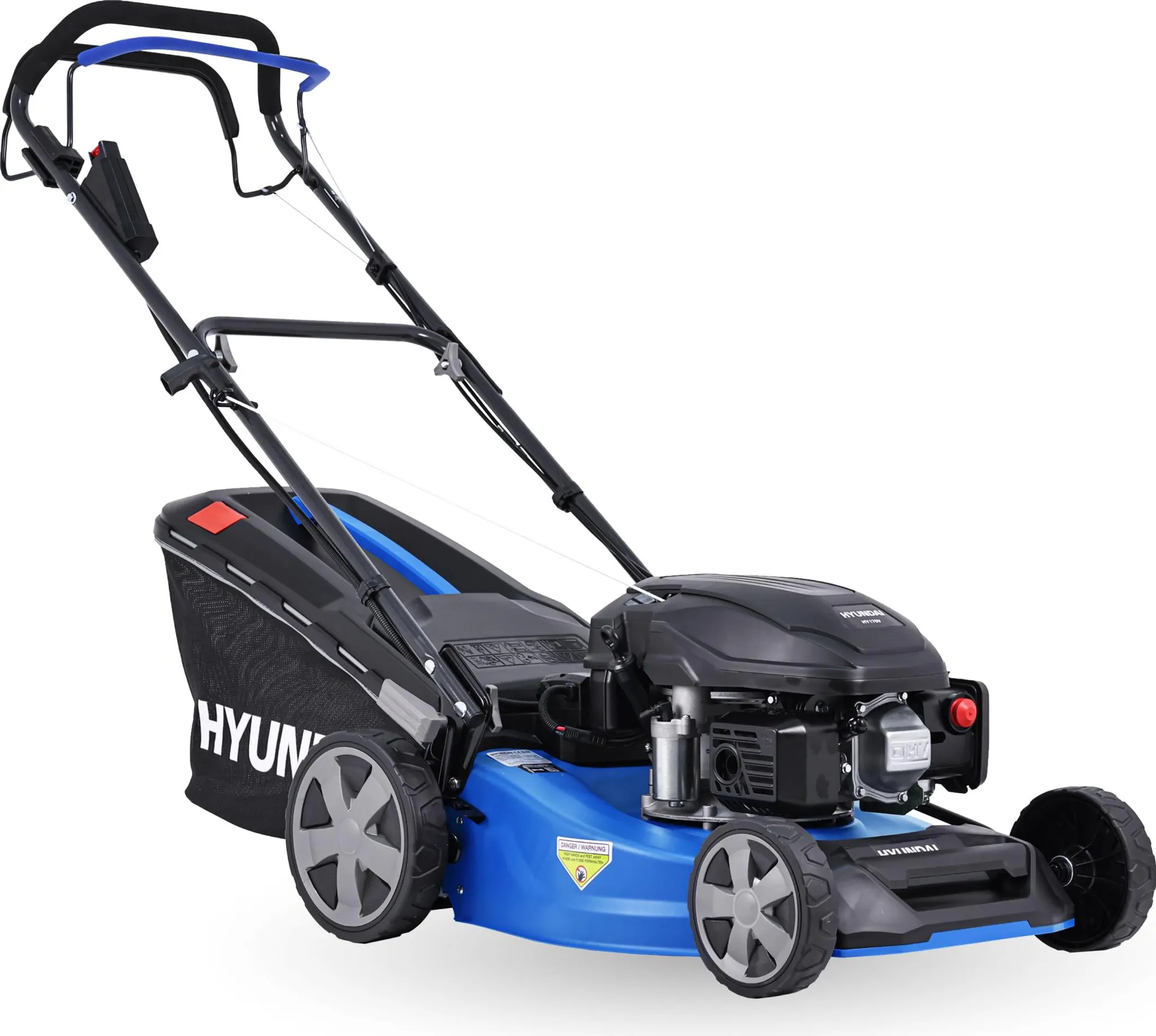 Technische Daten: 4-Takt Benzin OHV-Motor, 200ccm Hubraum, 3,5kW (4,8PS) bei 3300 U/min, Schnittbreite 97cm, 1 Vorwärtsgang mit Geschwindigkeit ca. 3km/h (ausschaltbar), variable Schnitthöhenverstellung 30-80mm, Räder Ø 33cm, Luftbereifung mit Geländeprofil, Benzintank 1,0l, Öltank 0,6l, Maße 1475x1032x1220mm, Gewicht 56,2kg