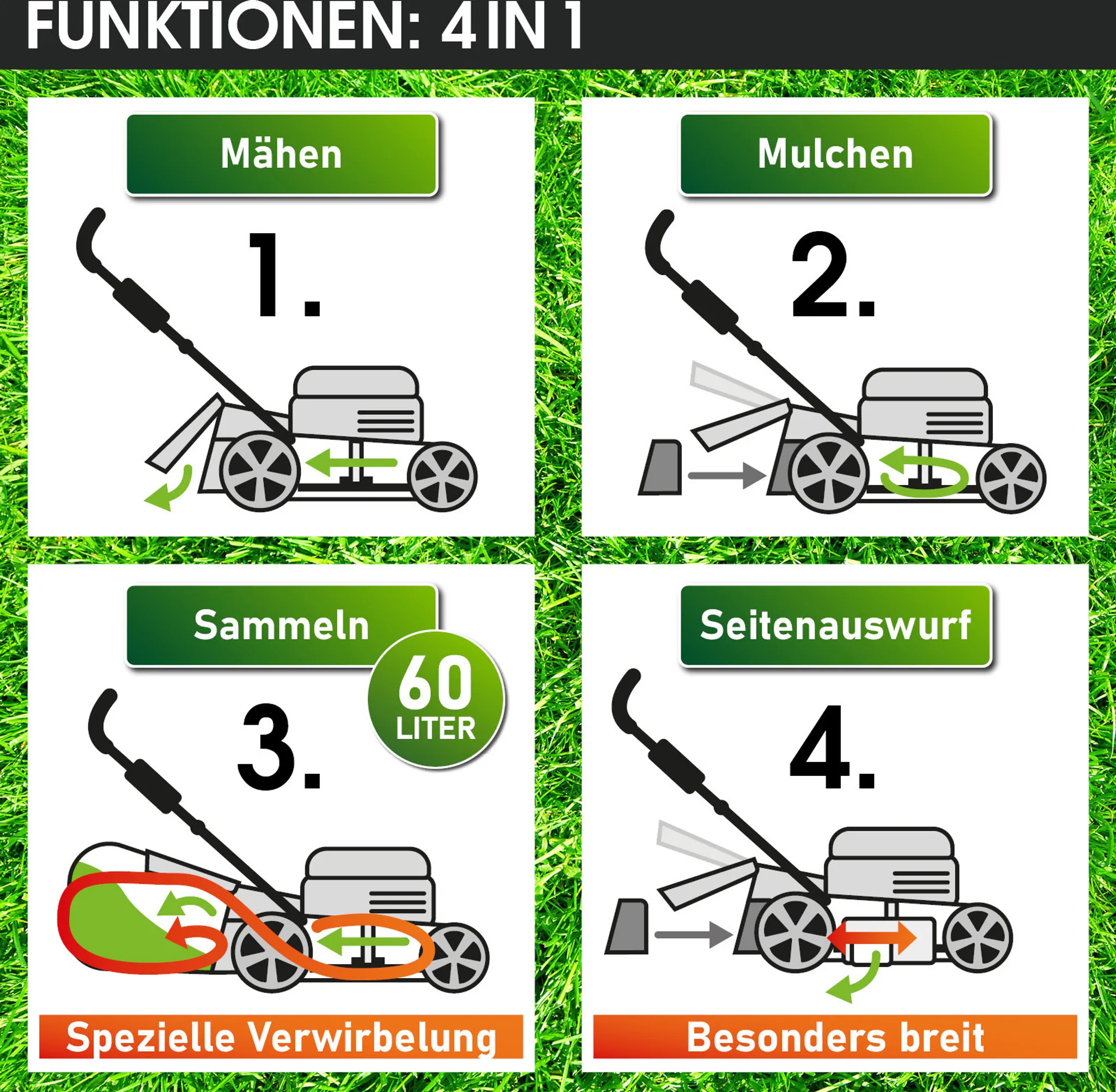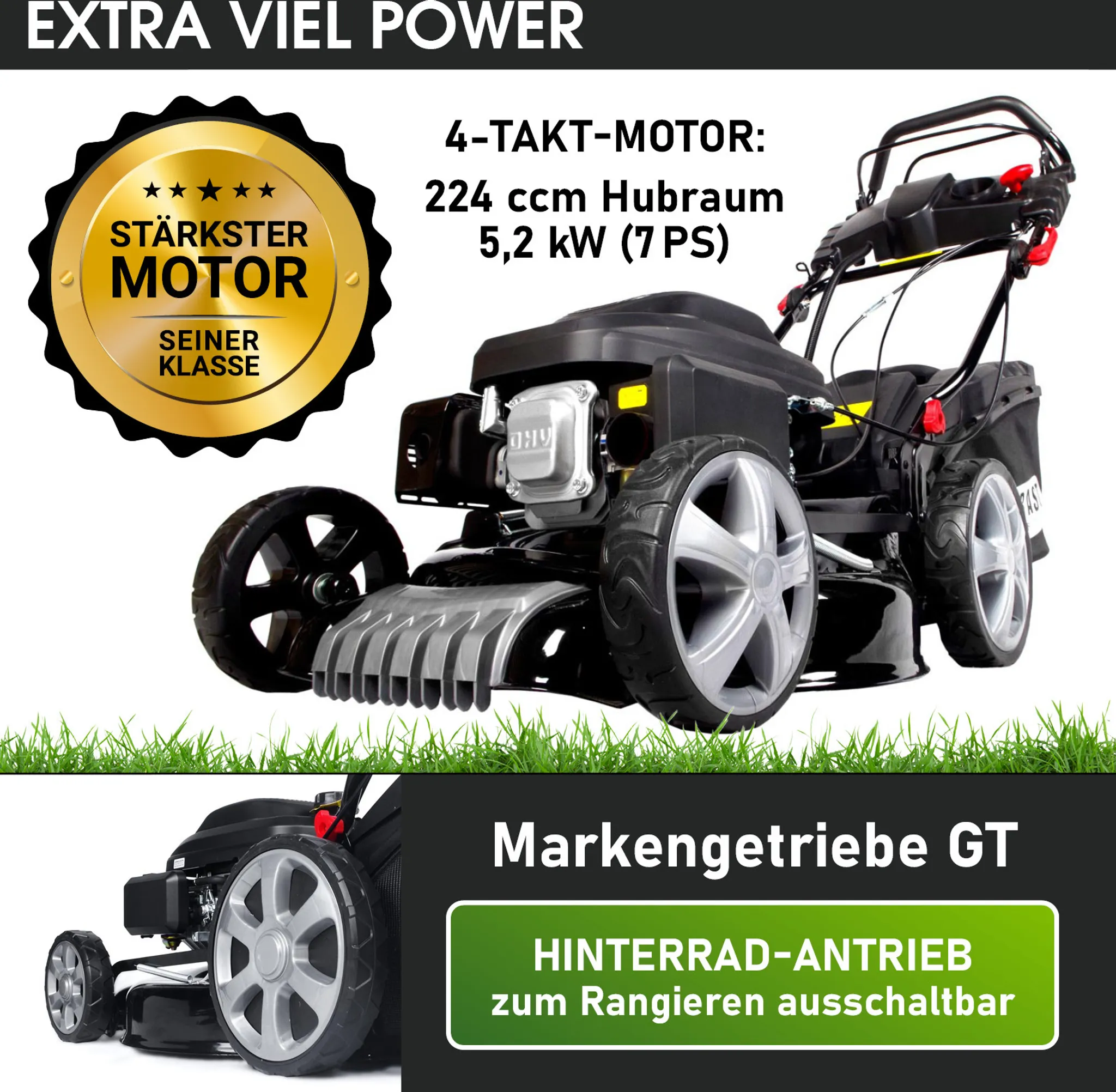 - Hinterradantrieb mit Markengetriebe von General Transmissions, Elektro-Start-Funktion, manuell steuerbarer Motordrehzahlregler, 4-in-1 Funktion (Mähen, Mulchen, Sammeln, Seitenauswurf), 6-stufig verstellbare Schnitthöhe, kugelgelagerte Big Wheeler Räder mit Grip-Profil, ergonomisch geformter & stufenlos höhenverstellbarer Führungsholm, dreifach einstellbares Chassis-Gestänge, Easy-Clean-Reinigungssystem, Rasenkamm, Cockpit mit Getränkehalter, Akkufach und Startknopf.