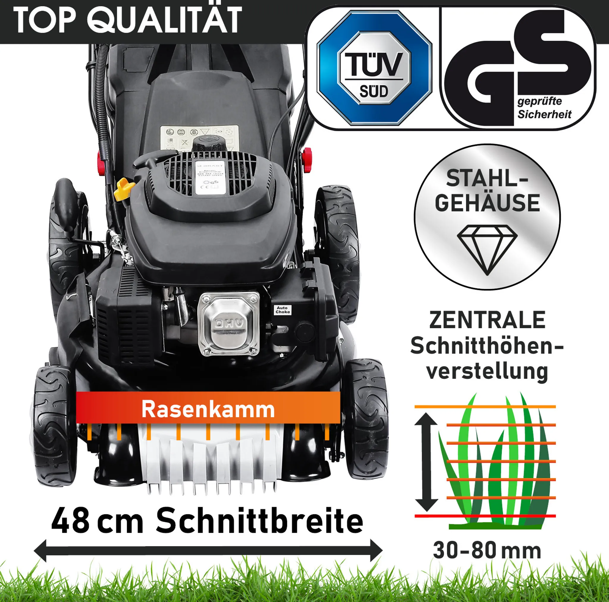 - Technische Daten: 4-Takt Motor mit 224cm³ und 5,2kW (7PS) bei 2.800U/min, Schnittbreite 48cm, Grasfangsack 60 Liter, Räder vorne 178mm, hinten 254mm, zentrale 6-stufige Schnitthöhenverstellung 30-80mm, Stahlgehäuse, Rasenkamm, Easy-Clean-System, Maße aufgebaut 145x54x106cm, Gewicht: 34,3kg, Schneidemesser aus Spezialstahl, manuell steuerbarer Motordrehzahlregler, Elektrostart-Funktion, Akku 10,8V, 1,5Ah, Ladegerät Eingang 100-240Vac, 0,2A Ausgang, 12,6VdC, 0,4A, Akku mit Ladestandsanzeige