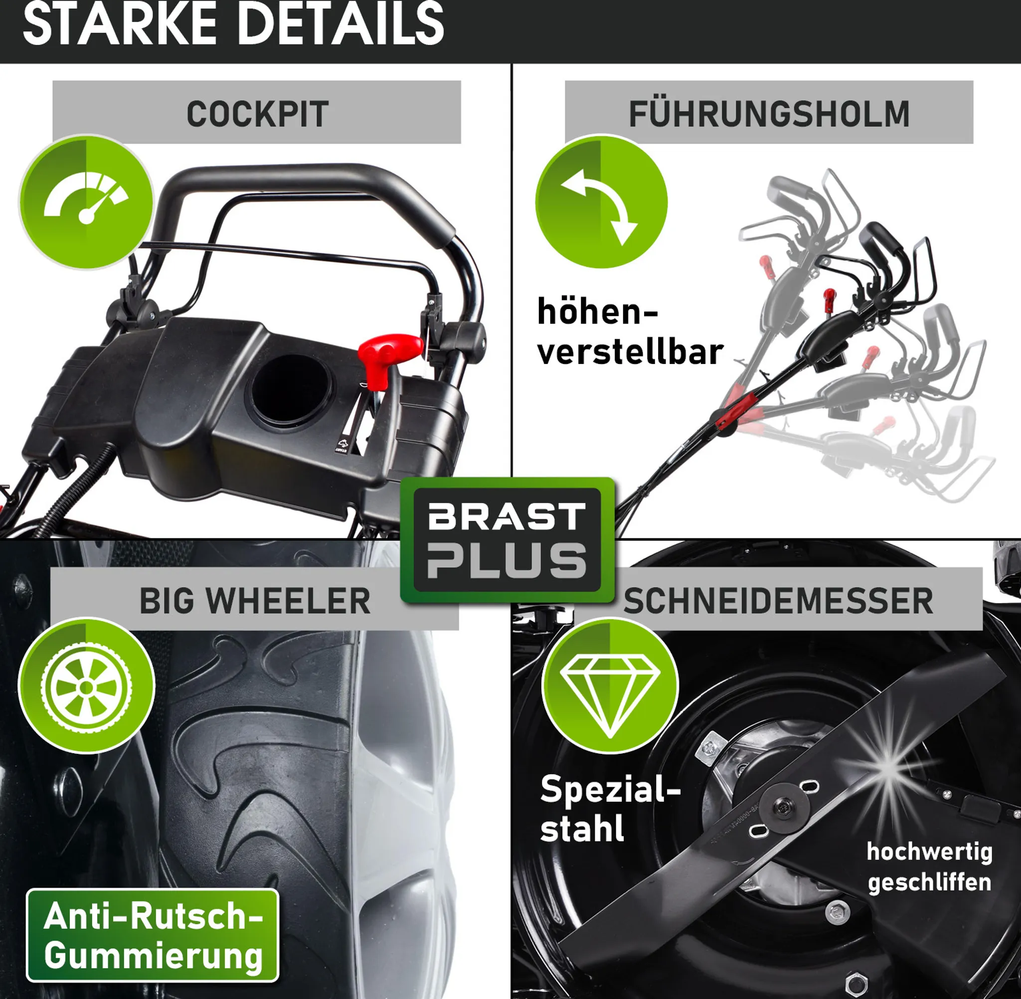 - Starke Details: Der Benzinrasenmäher mit Antrieb verfügt über kugelgelagerte Big Wheeler Räder mit Grip-Profil für leichtes Fahren auf unebenen Flächen, einem ergonomisch geformten & stufenlos höhenverstellbaren Führungsholm, dem dreifach einstellbaren Chassis-Gestänge und dem Easy-Clean-Reinigungssystem. Der praktische Rasenkamm richtet Grashalme für einen präzisen Schnitt auf und im Cockpit befindet sich der Motordrehzahlregler, ein Getränkehalter, Akkufach und Startknopf