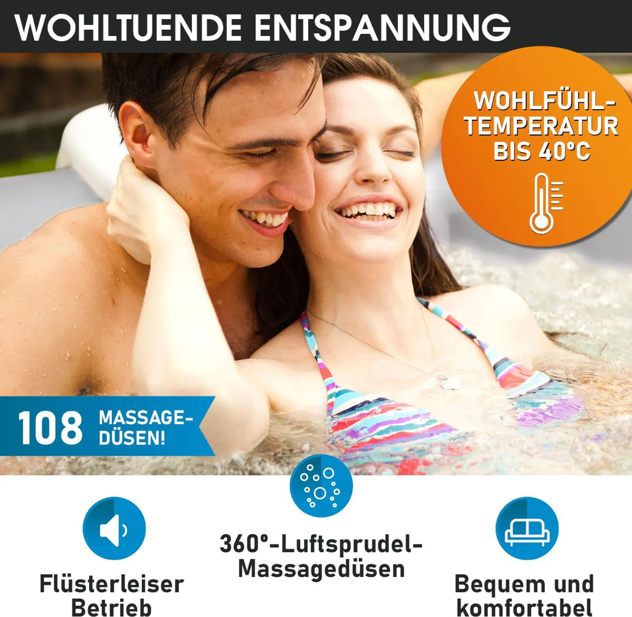 - Wohltuende Entspannung: Gönnen Sie sich zuhause ein erstklassiges Spa-Wellness-Erlebnis mit unserem aufblasbaren Whirlpool TEKAPO. Der Garten Whirlpool gehört zu den leisesten Modellen weltweit und bietet mit 108 Luftsprudel-Massagedüsen ein Massageerlebnis der Extraklasse, bei dem tausende Blasen für pure Entspannung sorgen. Die Wassertemperatur lässt sich bequem und präzise bis zu 40°C einstellen