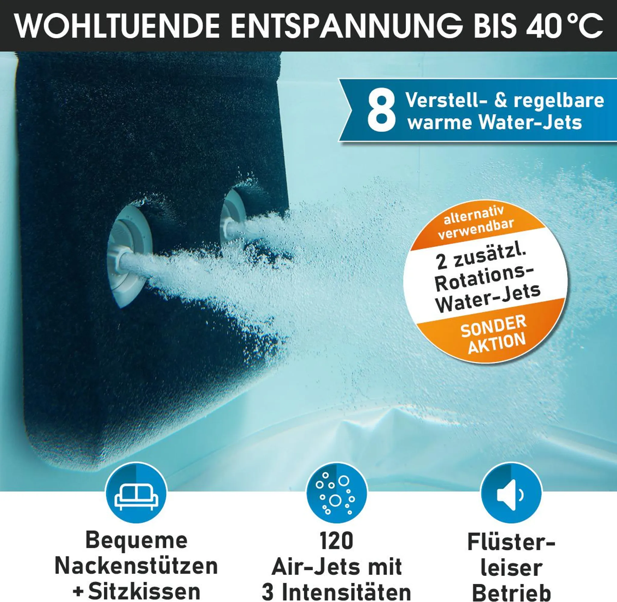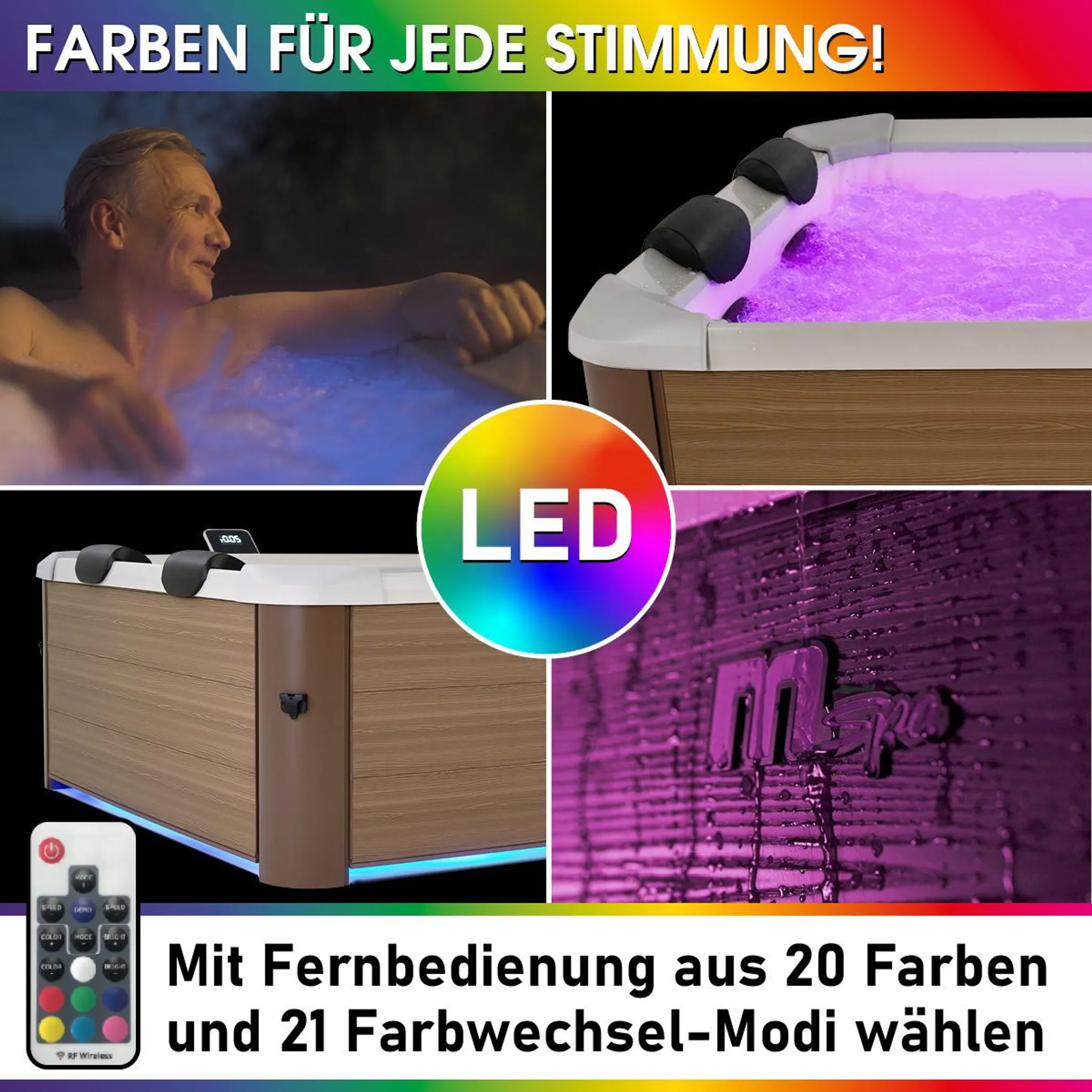- Wohltuende Entspannung: Erleben Sie ein exklusives Wellness-Erlebnis mit unserem Garten Whirlpool OSLO AMBER mit LED-Beleuchtung und 4 integrierten Sitz-, Nacken- & Rückenkissen. Wählen Sie aus 20 Farben & 21 Farbwechsel-Modi und stellen Sie die Wassertemperatur bis 40°C nach Belieben ein. Dieser Mspa Whirlpool gehört zu den Leisesten weltweit und verwöhnt Sie mit 120 Luftsprudel-Massagedüsen mit 3 einstellbaren Intensitäten & den 8 individuell ausricht- und regelbaren Warmwasser-Jet-Düsen