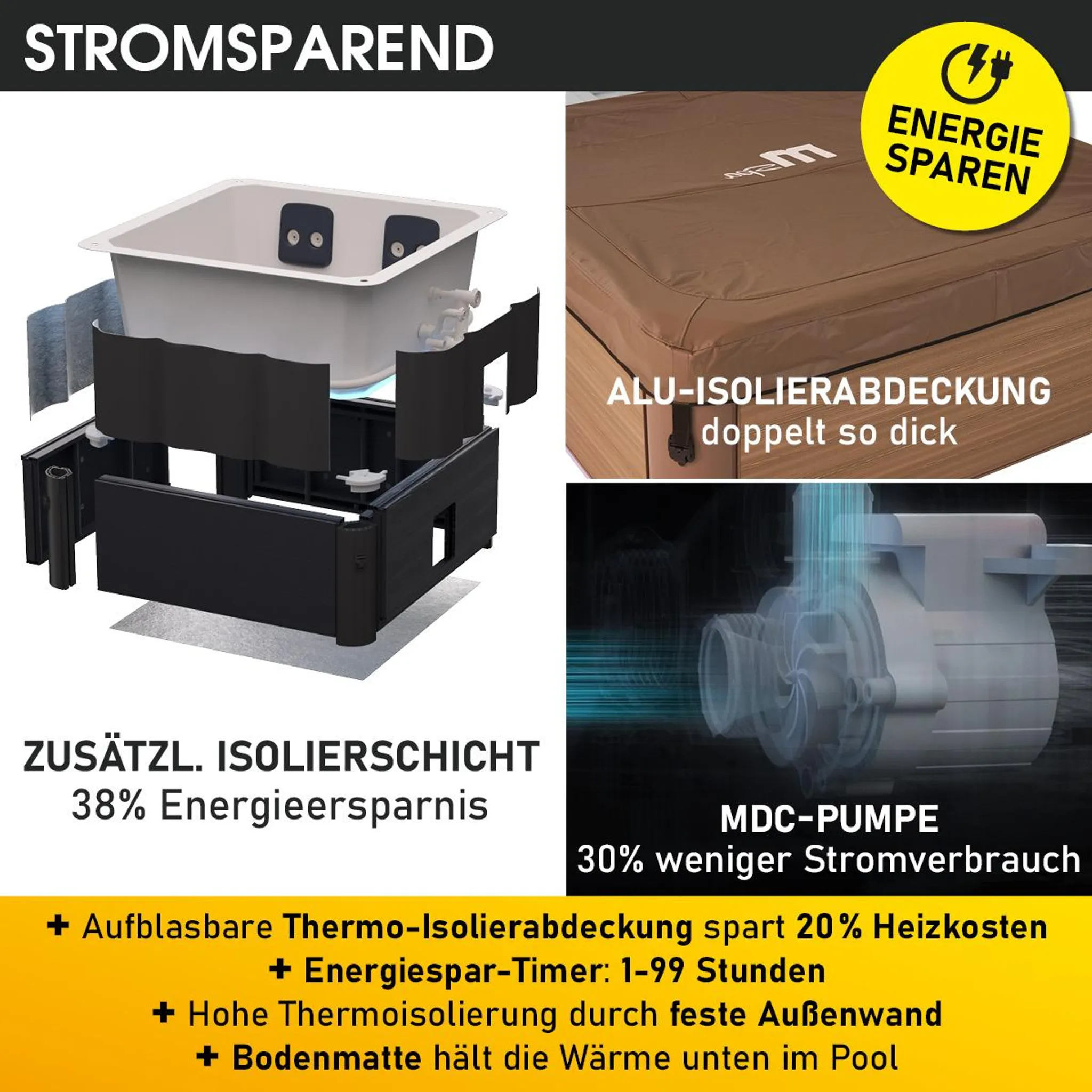 - Stromsparend: Der Außenwhirlpool verfügt über einige Technologien, die hohen Energiekosten durch stromsparende Eigenschaften entgegenwirken. Die MDC-Pumpe bietet mit 1800 l/Std 36% mehr Wasserdurchfluss bei 30% weniger Energieverbrauch. Zusätzlich helfen die Alu Isolierabdeckung, sowie die aufblasbare Thermoabdeckung, die Wärme im Pool zu halten. Die Bodenmatte isoliert von unten, sodass keine Wärme über den Boden verloren geht