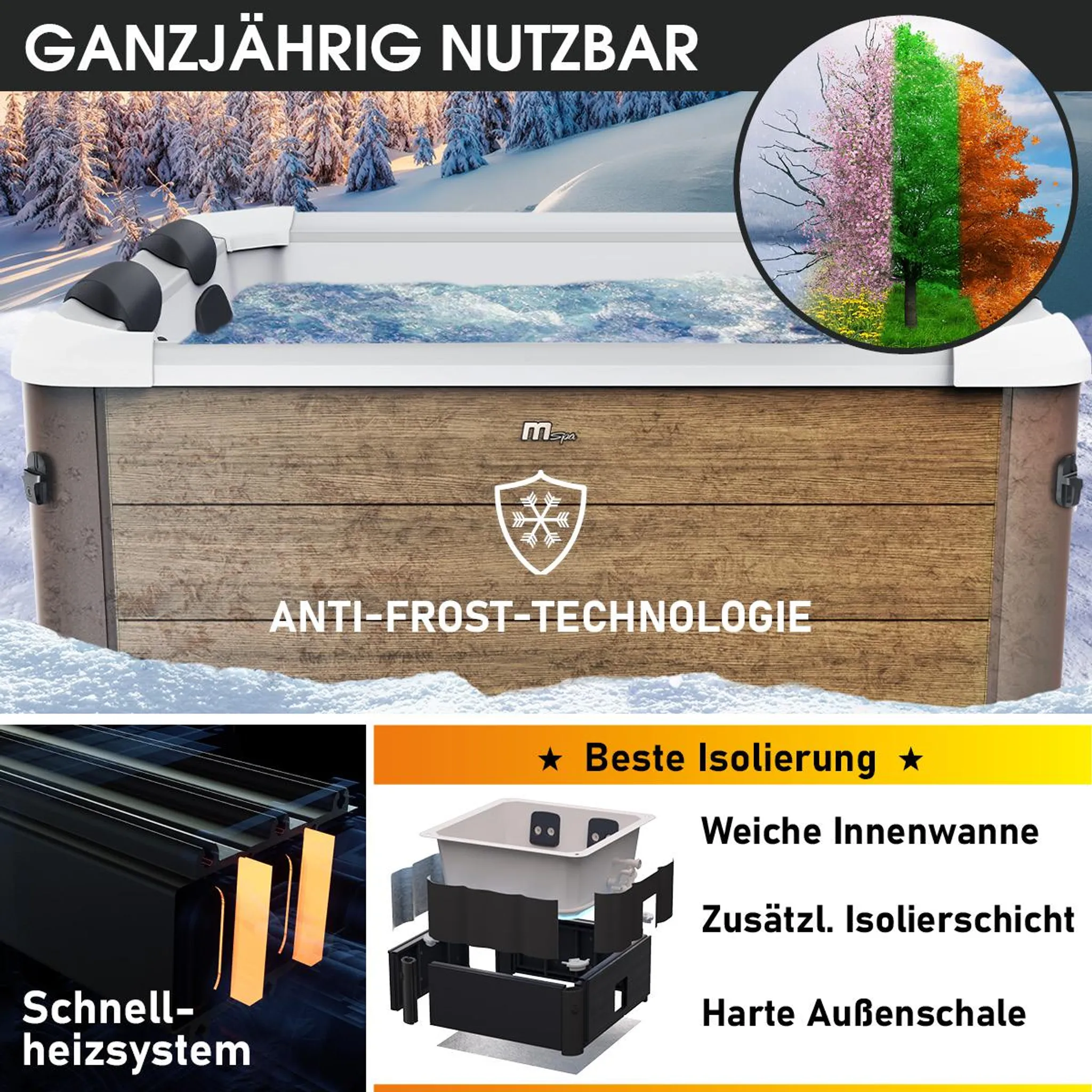 - Ganzjähriger Einsatz: Dank Anti-Frost-Technologie ist unser Outdoor-Whirlpool winterfest und ermöglicht eine ganzjährige Nutzung. Dabei wird die Heizung automatisch aktiviert, sobald die Wassertemperatur unter 1 °C fällt, und heizt auf 3 °C auf, um Frostschäden zu vermeiden.