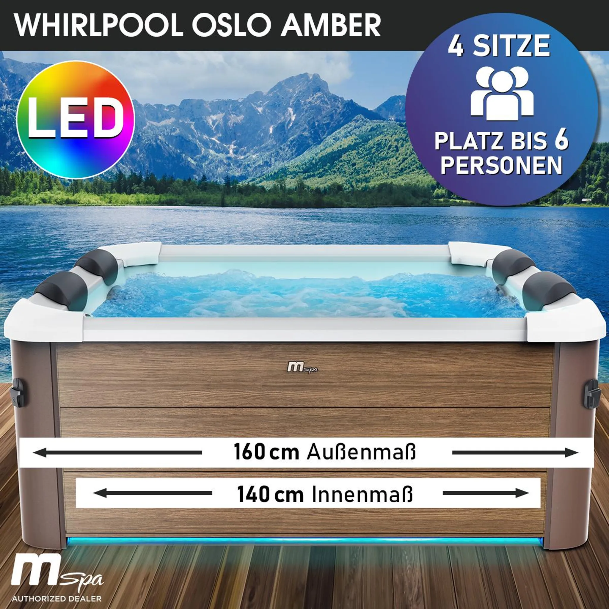 - Ihr Profi Whirlpool für Zuhause: Schaffen Sie einzigartige Wellnessmomente mit unserem Außenwhirlpool OSLO AMBER für bis zu 6 Personen. Die Steuerung der persönlichen Wellnessoase erfolgt dabei bequem über das OLED-Touchdisplay oder die erweiterte MSpa App 2.0