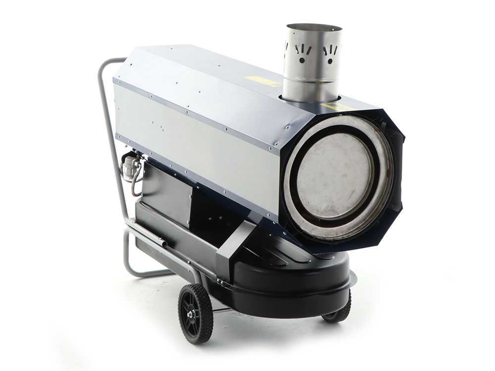 Diese Hochleistungs-Heizkanone wird mit Diesel befeuert und verfügt über eine indirekte Beheizung und einen Kamin zur Ableitung von Rauchgasen.