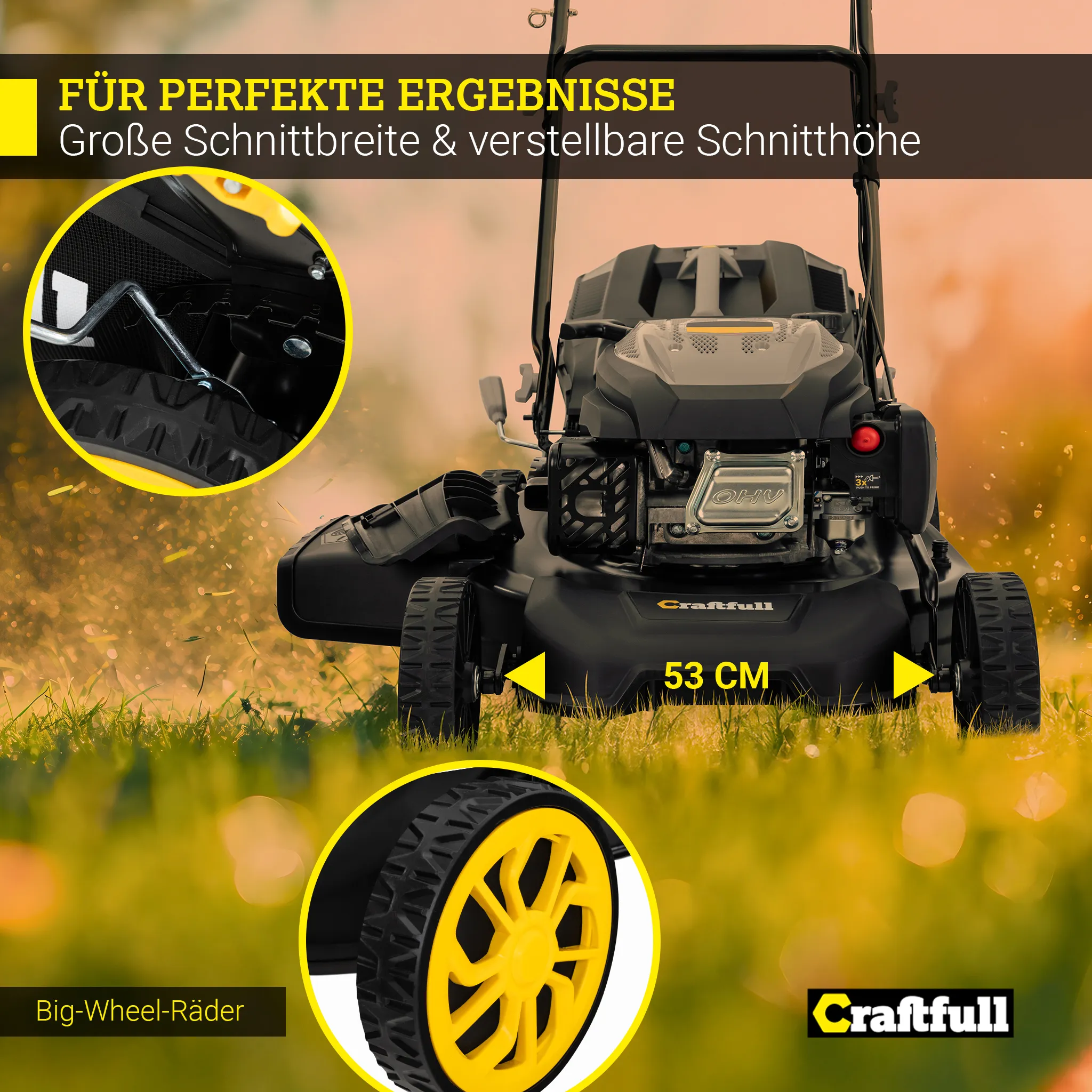 Craftfull Benzinrasenmäher CR-224-30 | Selbstfahrantrieb – Benzin Rasenmäher – Mäher – 53 cm Schnittbreite in 7 Höhenstufen – 4,2 kW/5,7 PS – 223 cm³