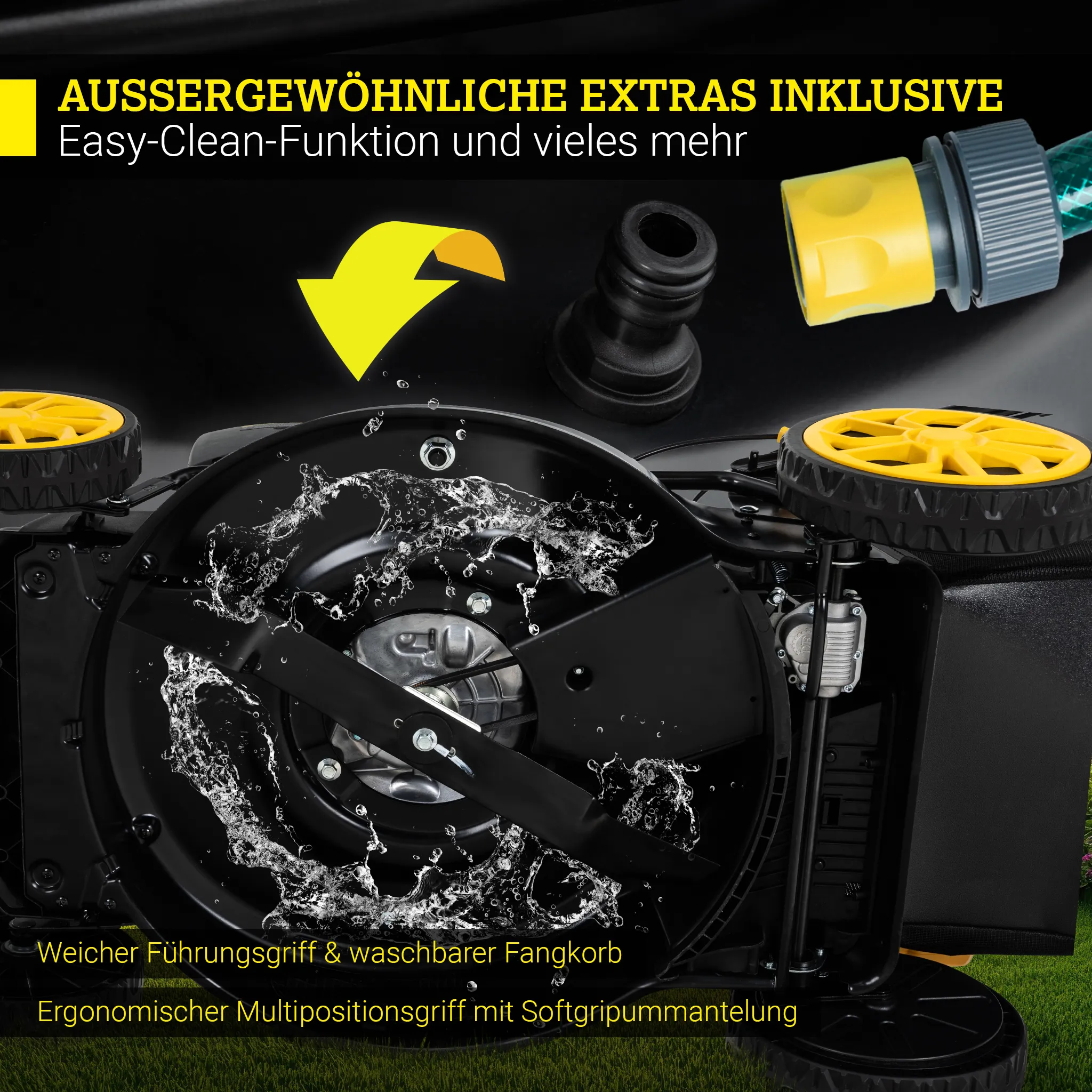 Auch nach dem Mähen bleibt es bequem: Über die Easy-Clean-Funktion kann ein handelsüblicher Gartenschlauch angeschlossen werden, sodass das Mähwerk schnell und einfach gereinigt wird.