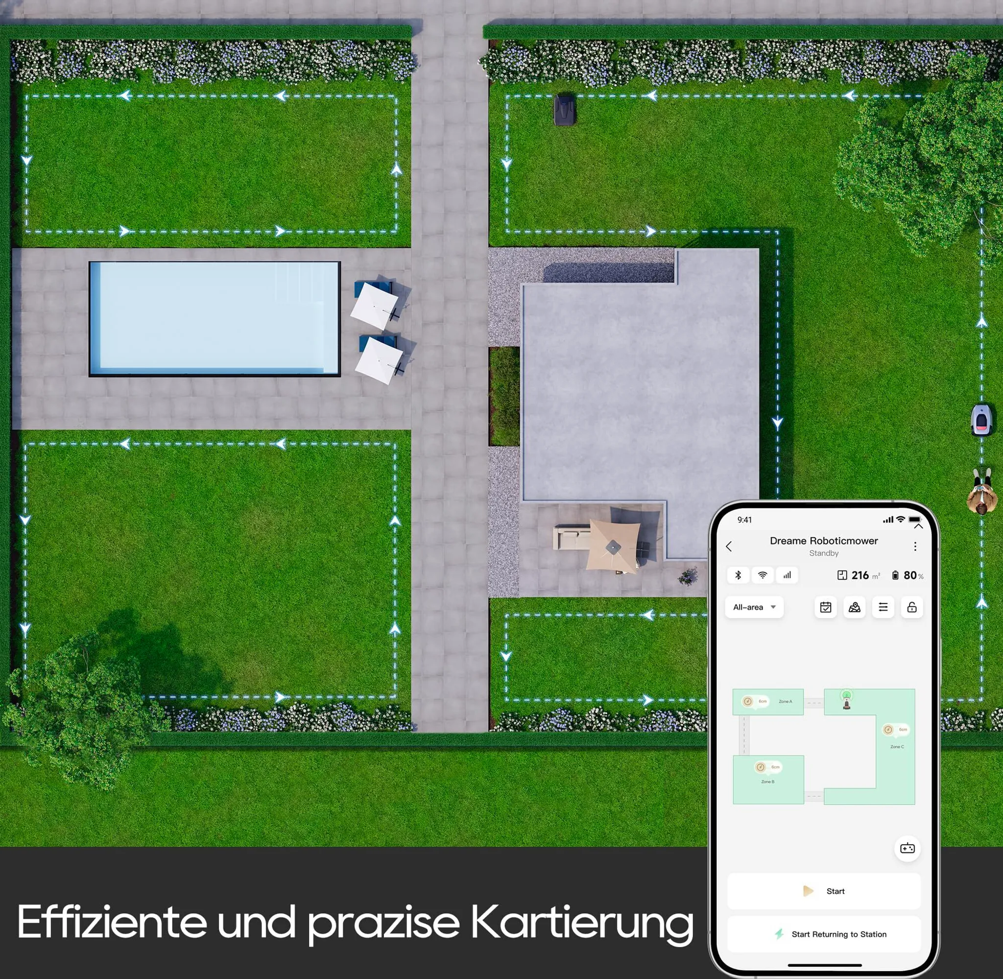 2. Intelligentes Bereichsmanagement leicht gemacht: Mit der Dreamehome-App können Mähroutinen spielend einfach festgelegt werden, ganz ohne ständige Überwachung. Egal ob Echtzeit- oder geplante Mähaufgaben, Mähbereiche, No-Go-Zonen oder voreingestellte Bereiche – alles lässt sich bequem über die App einstellen.