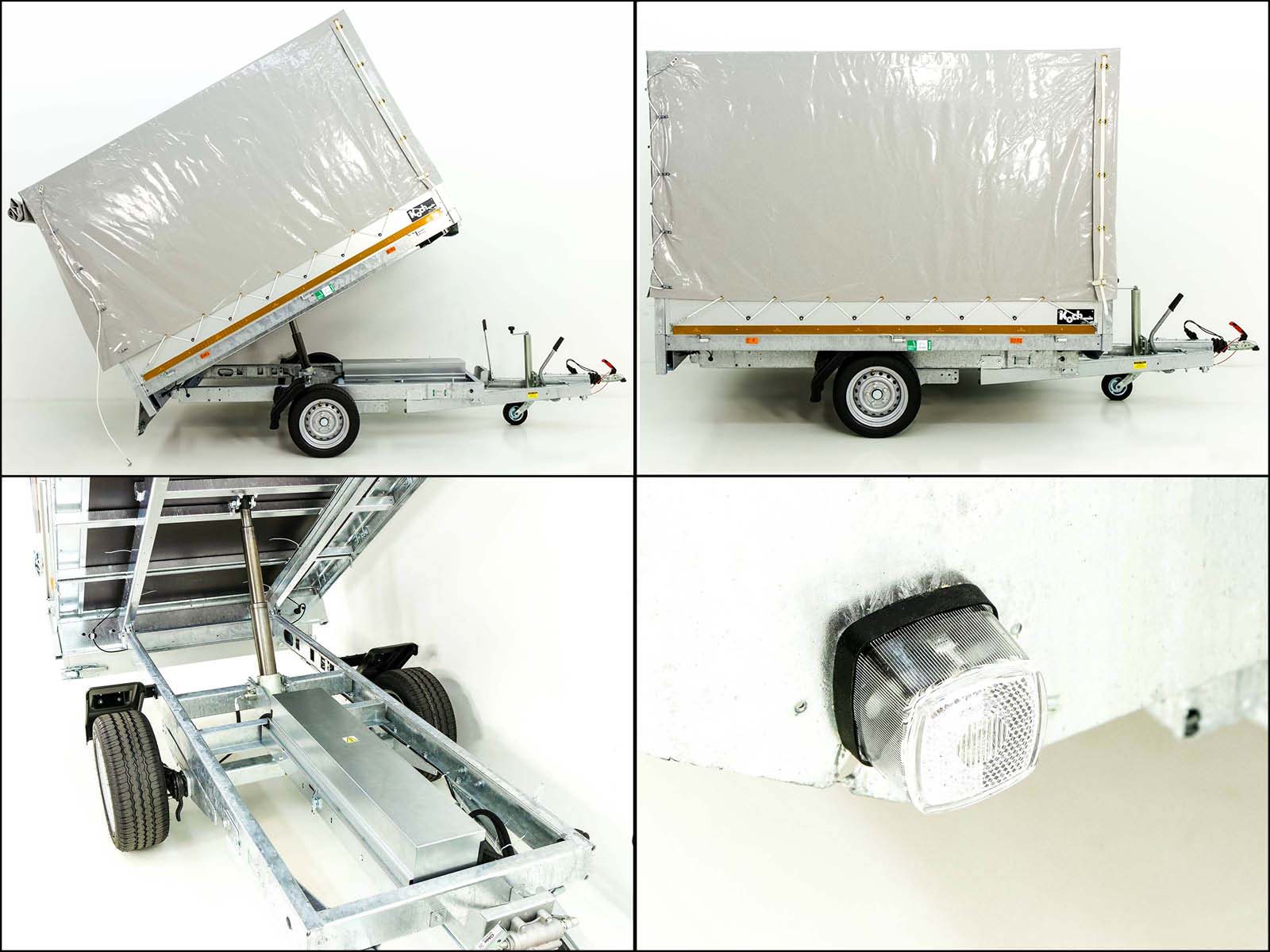 Dieser Eduard Heckkipper bietet eine Kombination aus einer Elektropumpe und einer Handpumpe für die flexible Bedienung. Ausgestattet mit einer Hochplane von 160 cm ist dieser Anhänger perfekt für den Transport von Materialien mit einer maximalen Nutzlast von 1.154 kg.