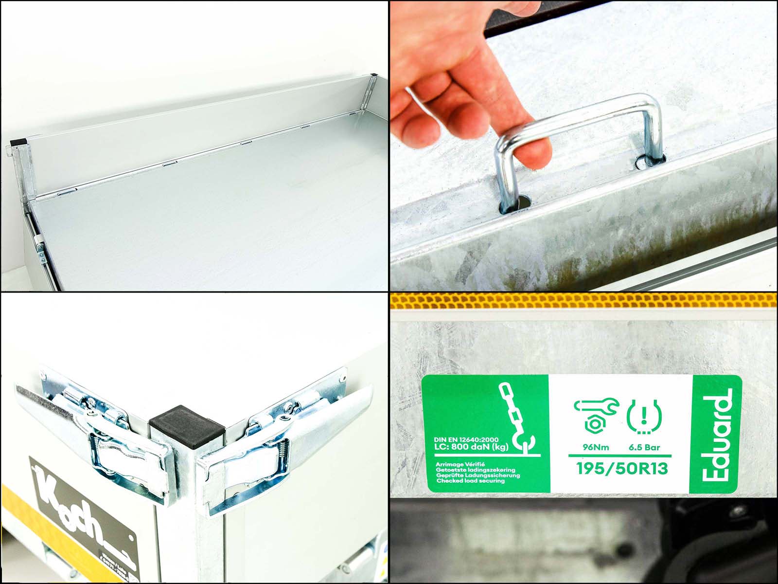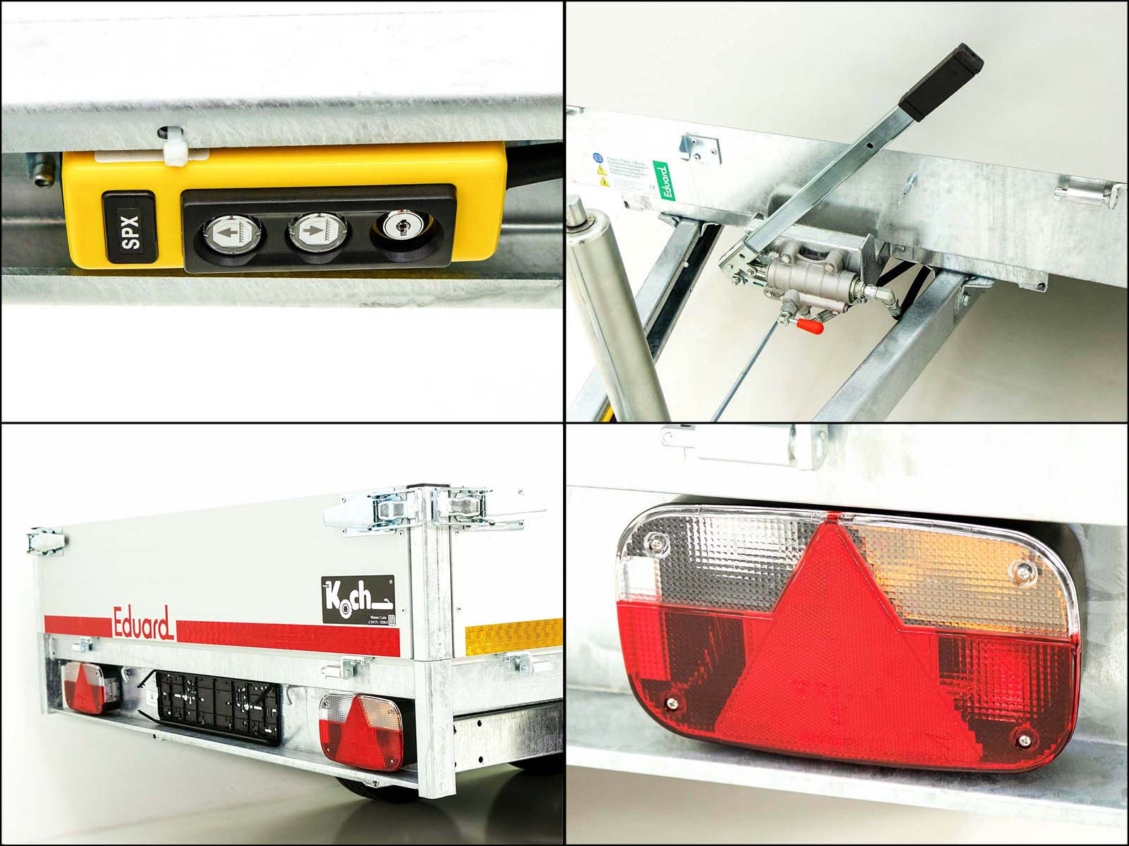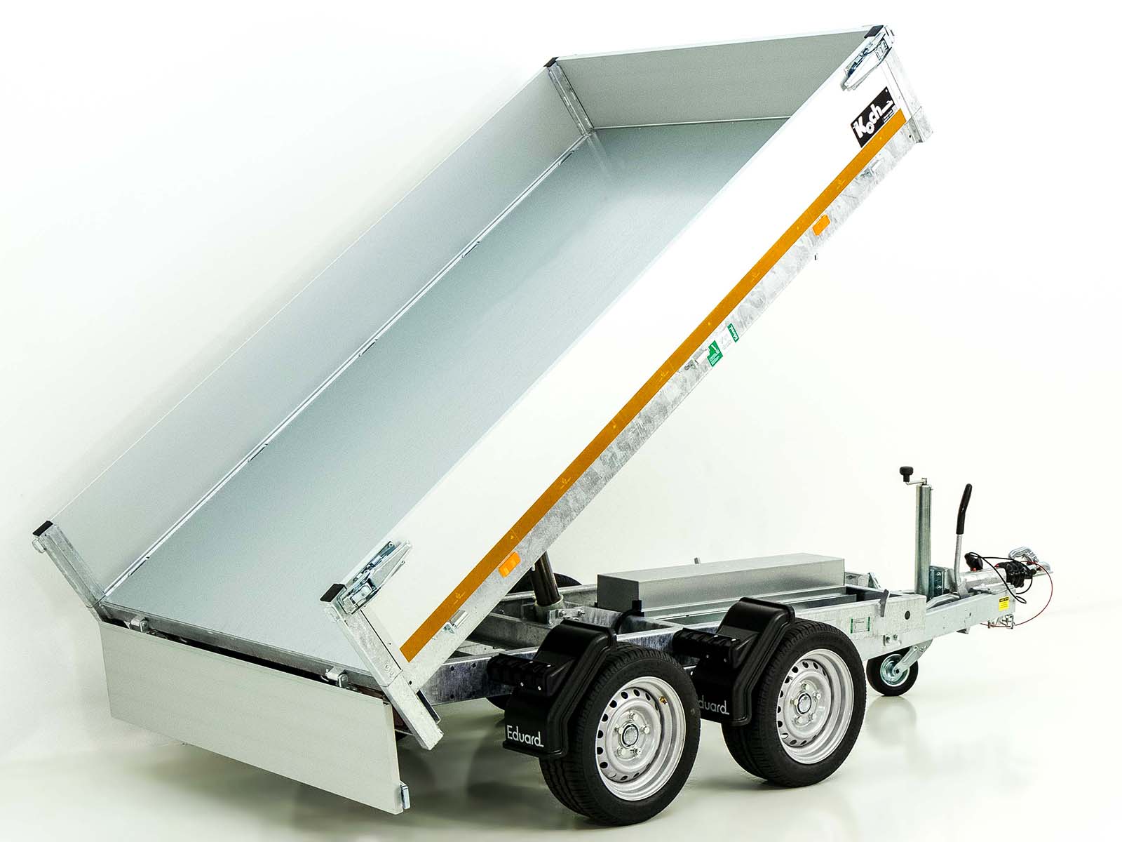 Der Eduard Heckkipper in dieser Ausführung bietet eine robuste, vielseitige Lösung für Transportaufgaben mit einer maximalen Zuladung von 1.388 kg. Ideal für den täglichen Einsatz mit einer einfachen Bedienung durch die E-Hydraulik- und Handpumpe.