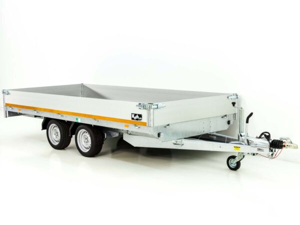 Der Eduard Hochlader Anhänger 4018 GD bietet eine großzügige Ladefläche von 180×406 cm und ein zulässiges Gesamtgewicht von 2,7 Tonnen. Mit einem Leergewicht von ca. 543 kg und einer Nutzlast von bis zu 2157 kg ist er ideal für mittlere bis schwere Transportaufgaben. Ausgestattet mit einem feuerverzinkten Stahlrahmen, abnehmbaren Aluminium-Bordwänden (300 mm hoch) und 16 Verzurrösen (800 daN) im Bodenrahmen sorgt dieser Anhänger für eine hohe Stabilität und eine sichere Ladungssicherung. Die Gummifederachse und das Automatik-Stützrad bieten hohe Fahrkomfort und einfache Handhabung. Der Anhänger ist mit einer Rückfahrautomatik ausgestattet und kann auf Wunsch mit einer 100 km/h Zulassung versehen werden.