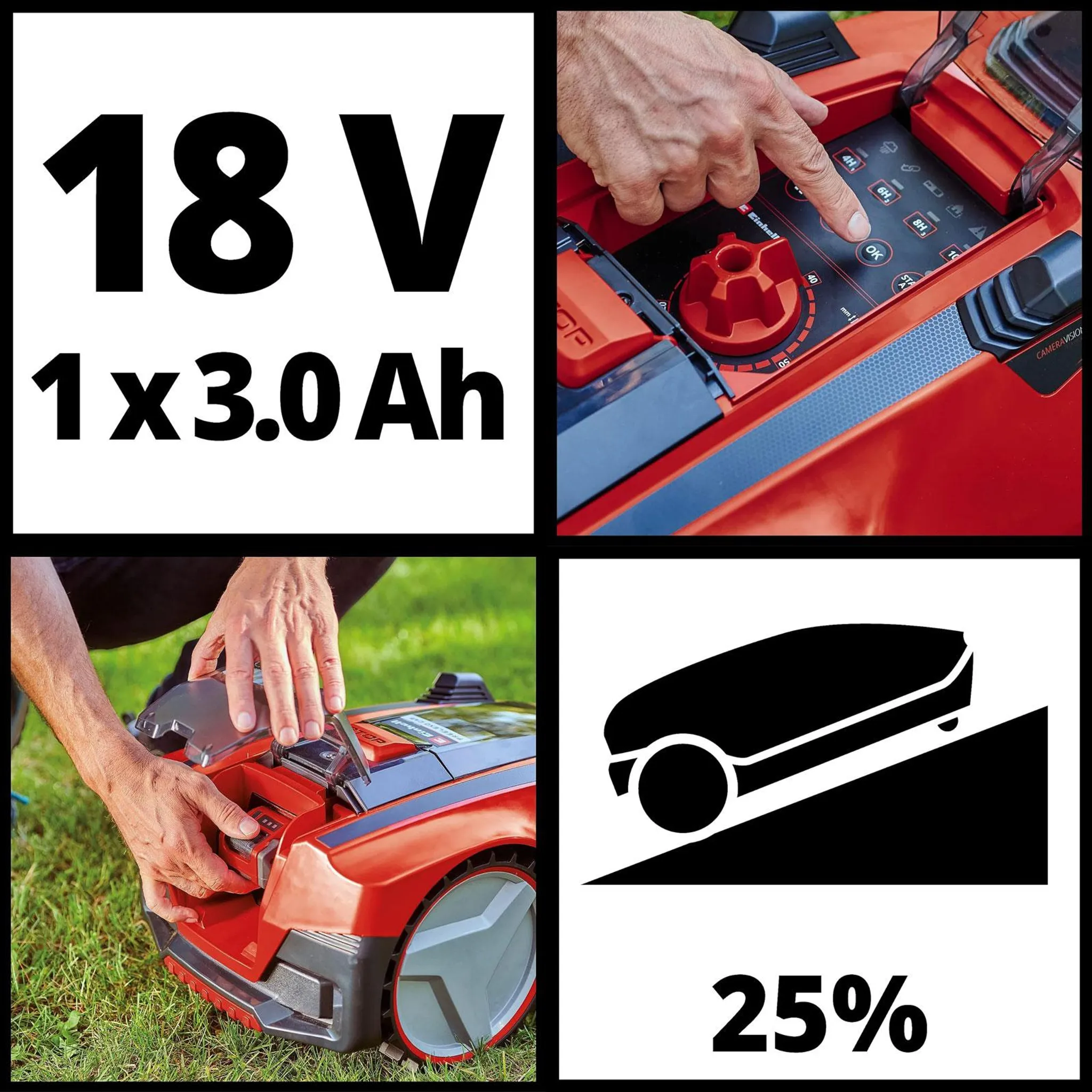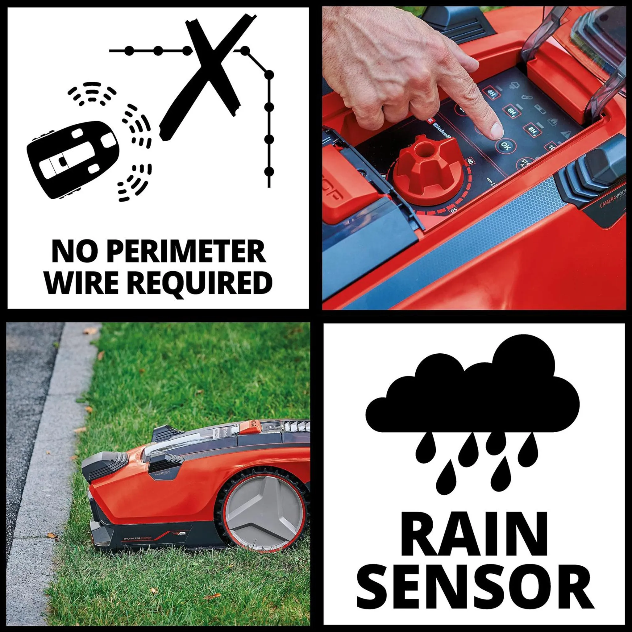 - Integrierte Kamera zur Erkennung der Rasenfläche, Magnetband für temporäre Abgrenzungen, bürstenloser Motor, Regensensor, automatische Rückkehr zur Ladestation, geeignet für Steigungen bis 25%.
