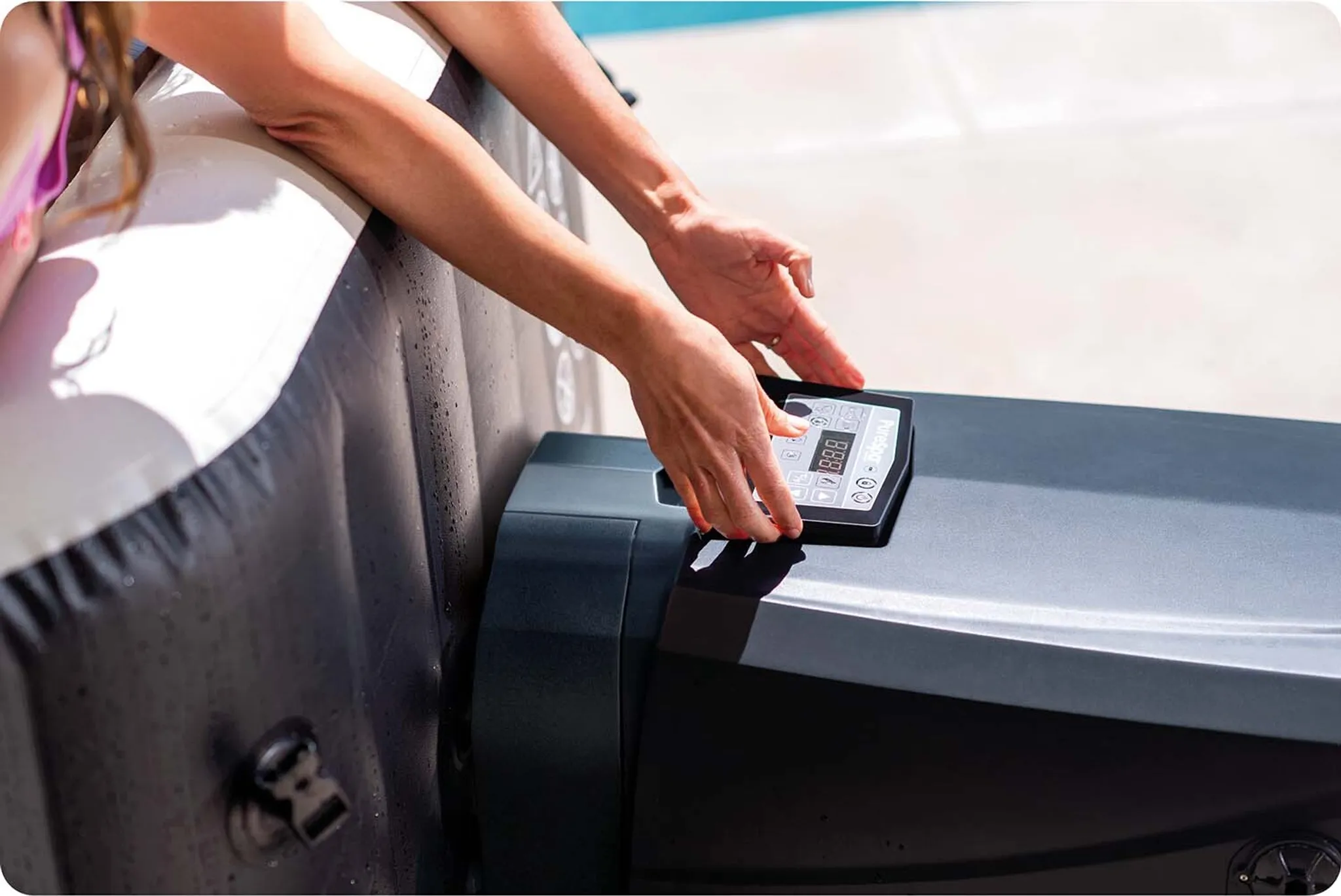 Der EXIT Leather Premium Whirlpool ø156x70cm ist ein Whirlpool, der Wellness-Feeling in den eigenen Garten bringt. Der schwarze Whirlpool wird standardmäßig mit einer Filterpumpe, die auch heizen kann, und einer isolierenden Abdeckplane geliefert. Der Whirlpool bietet Platz für zwei Personen und wirkt dank des schicken schwarzen Leder-Prints ausgesprochen edel. Der EXIT Leather Premium Whirlpool hat eine schwarze Außenseite mit Ledermuster und eine weiße Innenseite. Dieser Whirlpool hat eine Schaumstoffwand von nicht weniger als 8 Zentimetern Dicke und ist daher stabil und isolierend. Dank der Schutzfunktion des Whirlpool-Bodens ist keine separate Bodenplane erforderlich. Darüber hinaus bietet der Schaumstoffboden einen ausgezeichneten Sitzkomfort. Der Whirlpool lässt sich einfach aufbauen. Mit der isolierenden Abdeckplane inklusive Sicherheitsschloss schließt du einfach den Whirlpool ab und bleibt das Wasser warm. Der EXIT Leather Premium Whirlpool ist dank seiner Multifunktionspumpe, die das Wasser reinigt und gleichzeitig auf bis zu 40 Grad Celsius erhitzt, praktisch wartungsfrei. Mit dem digitalen Bedienfeld kannst du ganz einfach die Temperatur einstellen und die 90 Luftdüsen aktivieren, um für ordentlich Bläschen zu sorgen.