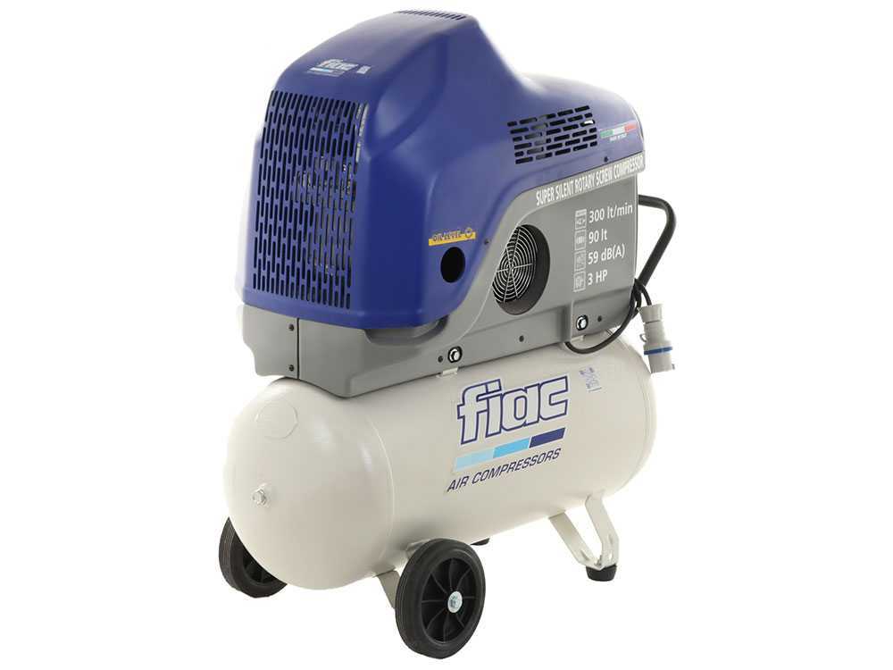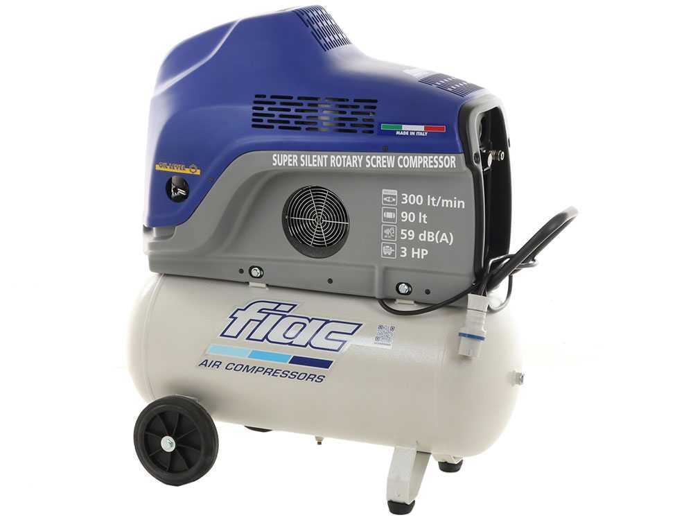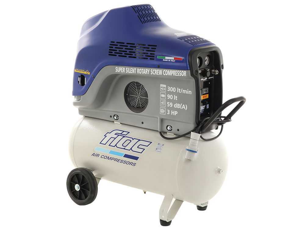 Der Schraubenkompressor FIAC NEW SILVER 3/90 hat einen Tank mit Fassungsvermögen von 90 Liter . Er weist eine Ansaugleistung von 300 lt/pro Minute auf. Er hat eine Nennleistung von 2,2 kW ( 10 PS) und er kann einen max. Druck von 9 bar erzeugen. Im Vergleich zu dem üblichen Kolbenkompressor ist der Schraubenkompressor leiser.