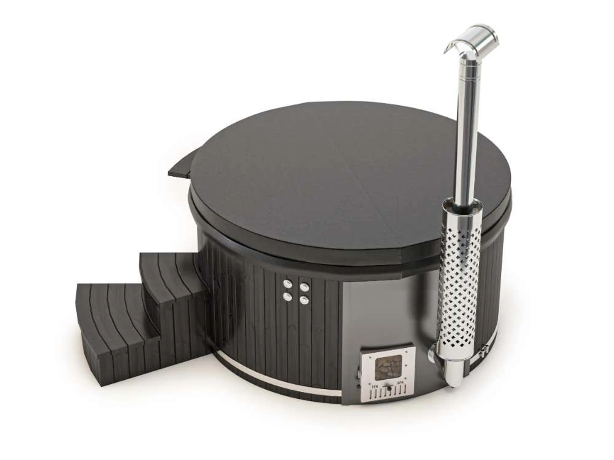 Finntherm Holz Badefass Stockholm aus Thermoholz, Whirlpool, Hot Tub Ø 200 cm, 8 Personen, inkl. Edelstahl-Ofen (30 kW), Minibar, Schwimmbecken, Badebottich