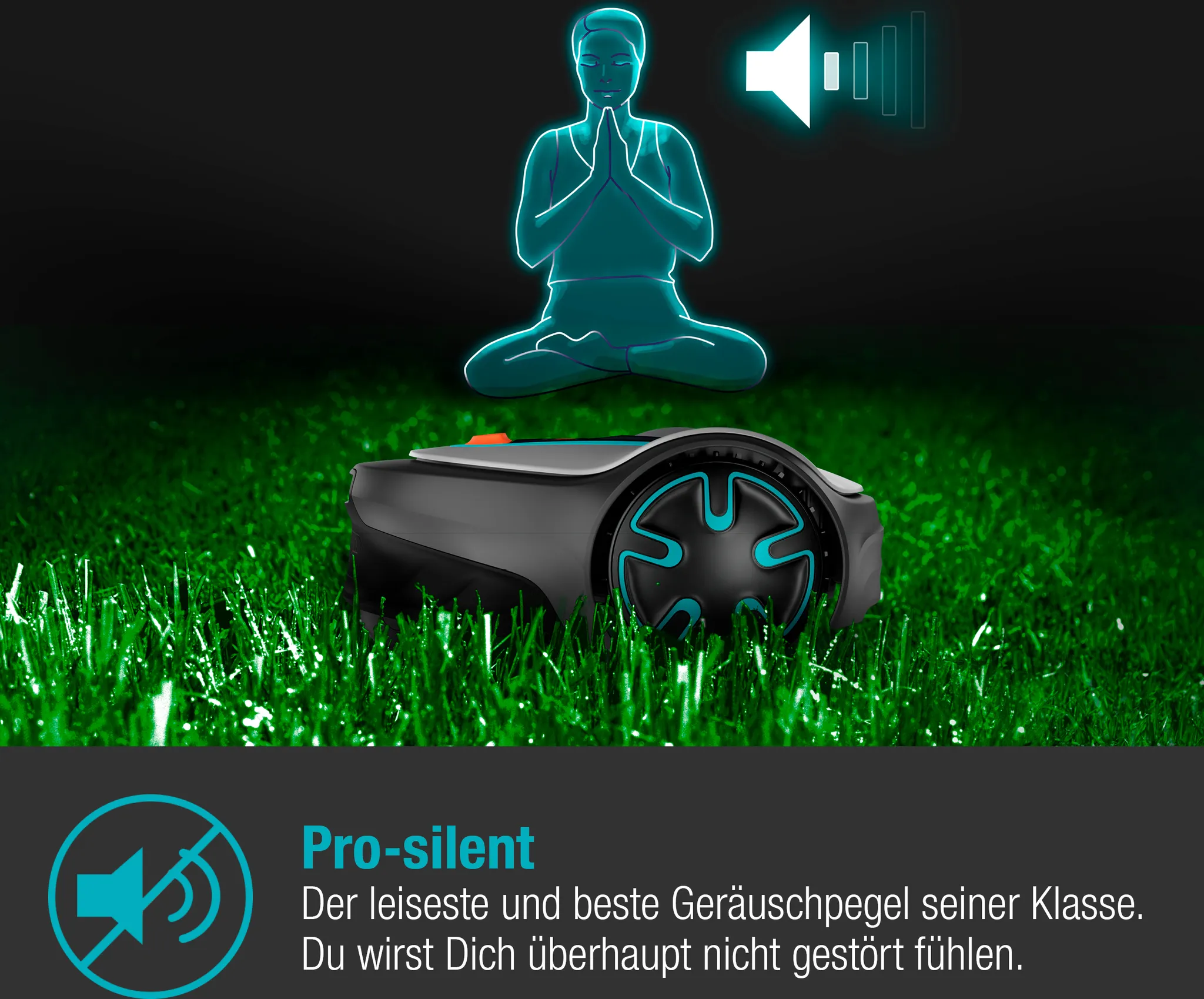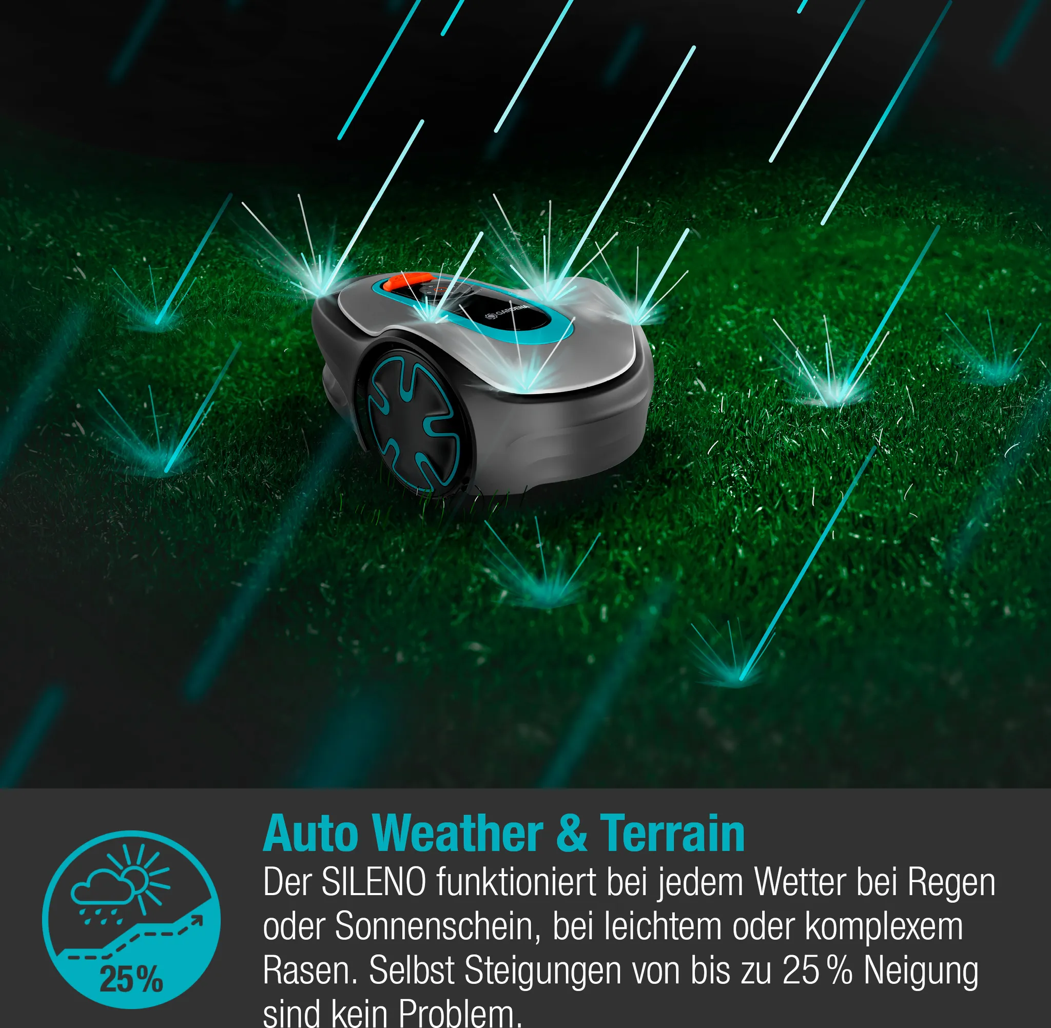 Der GARDENA Mähroboter SILENO minimo 500 m² ist ein geräuscharmer, vielseitiger und intelligenter Rasenmäher mit optimaler Konnektivität. Er ist ideal für kleinere und komplexe Rasenflächen. Einfach die Rasengröße und Mähzeiten in der GARDENA Bluetooth® App über das Smartphone eingegeben und schon kann es losgehen: Die GARDENA Bluetooth® App führt intuitiv Schritt für Schritt durch die Installation. Die Einrichtung des SILENO minimo mit EasyApp Control über Bluetooth® aus bis zu 10 Meter Entfernung ist ganz einfach. Die GARDENA Bluetooth® App unterstützt mit einem Planungsassistenten, der dabei hilft, sich um den Garten zu kümmern. SILENO minimo weiß, wie oft und wie der Rasen am besten gemäht wird. Der SILENO minimo ist einer der leisesten Rasenmäher auf dem Markt. Mit dem besten Geräuschpegel seiner Klasse von nur 57 db(A) werden die Nachbarn nicht gestört. Ob schmale Pfade, Sackgassen oder andere schwer zugängliche Bereiche – mit der CorridorCut-Funktion kann der SILENO minimo diese kniffligen Gebiete erreichen und makellos mähen. Der Roboter beurteilt dank SensorControl selbst, wie oft der Rasen getrimmt werden muss, und fährt genau entsprechend dem Graswachstum los. Mit Auto Weather & Terrain mäht der SILENO minimo zu jeder Jahreszeit, bei jedem Wetter, sogar bei Regen. Dank seines Frostsensors merkt der Mähroboter, wenn der Boden gefroren ist, und stoppt sein Programm, bis der Boden aufgetaut ist. Das Begrenzungskabel zeigt dem SILENO minimo an, welcher Teil des Gartens gemäht werden sollte. In ähnlicher Weise leitet das Leitkabel den Robotermäher vollautomatisch durch alle Mähbereiche, durch enge Zwischenräume und schließlich zurück zur Ladestation. Steigungen oder Gefälle von bis zu 25 Prozent sind kein Problem. Wenn die Arbeit beendet ist, können Schlamm, Staub und Grasreste bei Bedarf einfach mit einem Gartenschlauch abgespritzt werden. Rasen mähen ist mit dem SILENO minimo so einfach, dass man sich entspannen kann, während der Robotermäher die Arbeit erledigt. Mit dem SILENO minimo von GARDENA sieht der Rasen immer gepflegt aus.