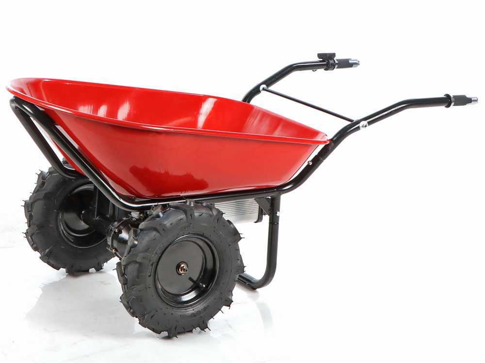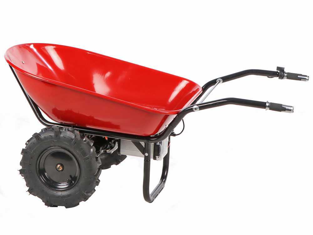 Die Schubkarre ist selbstfahrend und die Geschwindigkeit kann mit dem Hebel eingestellt werden. Die Maschine ist mit einem Vorwärts- und einem Rückwärtsgang ausgestattet. Der Lithium-Akku hat eine Kapazität von 6 Ah und eine Spannung von 40V.
