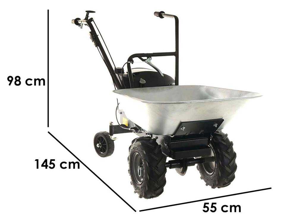 Das robuste Chassis aus Stahl, der Lenkhebel mit drei Vorwärtsgängen und einem Rückwärtsgang und der Motor Briggs & Stratton CR950 machen aus diesem Gerät ein wirksames und effizientes Transportgerät.