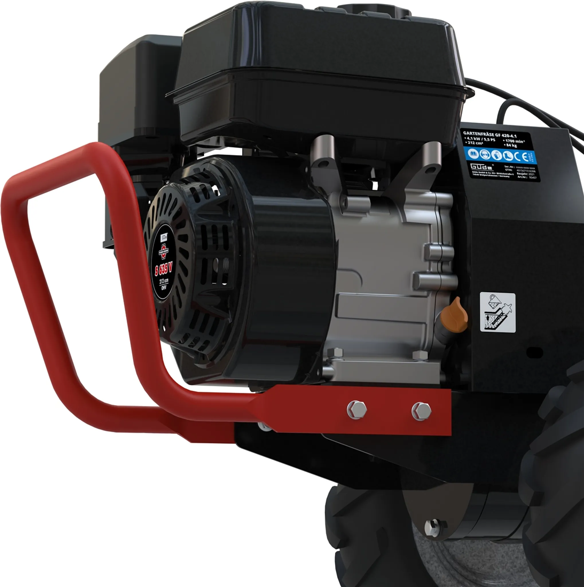Benzin-Gartenfräse GF 420-4.1 – 4-Takt Power-Engine Motor – 3-fach höhenverstellbarer, gummierter Handgriff – Geländetaugliche Luftreifen mit Grobstollenprofil – Räder mit Freilauf – Vor- und Rückwärtsgang separat Zuschaltbar – Verbaute Rutschkupplung verhindert das Drehen der Hackmesser beim Rückwärtsfahren – Ölmangelsicherung – 5-fach einstellbarer Tiefenbegrenzer – Reversierstarter – Benzinhahn – Hackmesser aus verschleißarmen Stahl für hohe Standzeit, drehen in Fahrtrichtung – Für Bodenaufbereitung mittlerer Flächen, zur Einarbeitung von Mulch, Torf, Sand, Dünger oder Kompost Hersteller: Guede GmbH, Dieselstr. 8, 58840 Plettenberg, DE, +492391919015, Info@guede.net Lieferung direkt vom Hersteller. Kein Lagerartikel! Lieferung frachtfrei. Artikel ist von der Rücknahme ausgeschlossen!