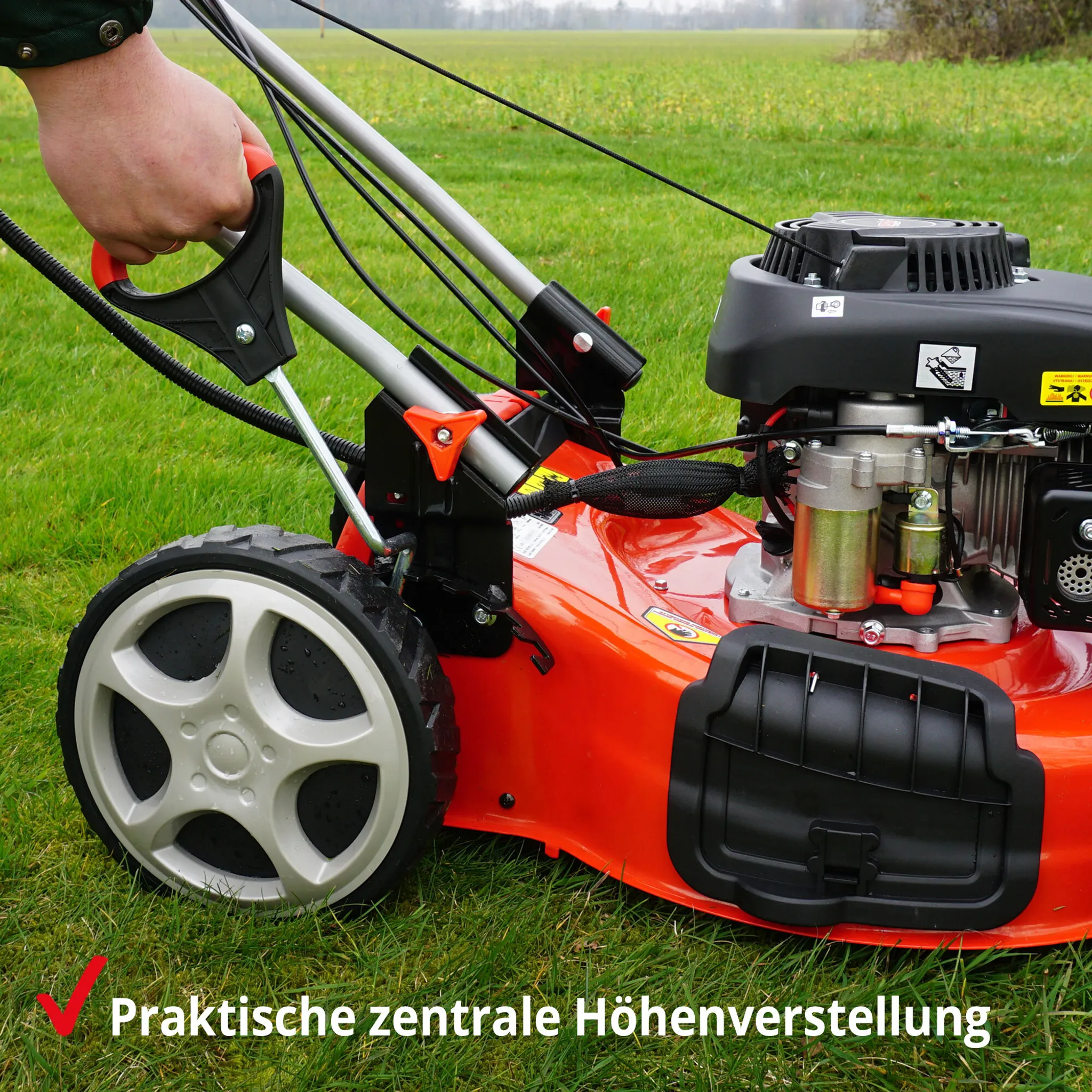 5-in-1 Funktion: Mähen, Fangen, Mulchen, Seitenauswurf und Laub-/Ästezerkleinern / 3,6 km/h Radantrieb / Eco-Motor / Elektrostart / Inklusive Mulchkit und Seitenauswurf / Ergonomischer Führungsholm / Zentrale 7-fach Höhenverstellung von 25 mm bis 75 mm