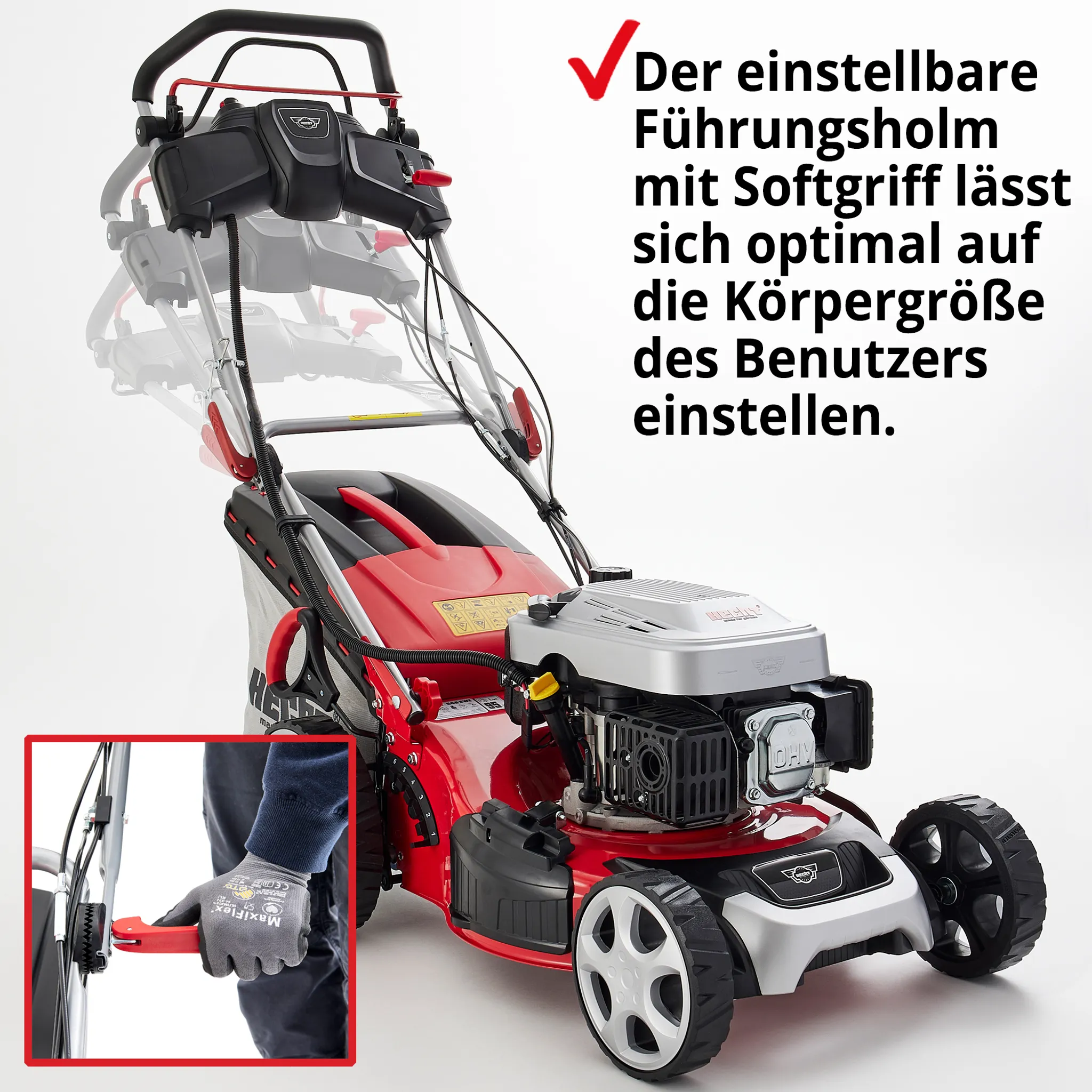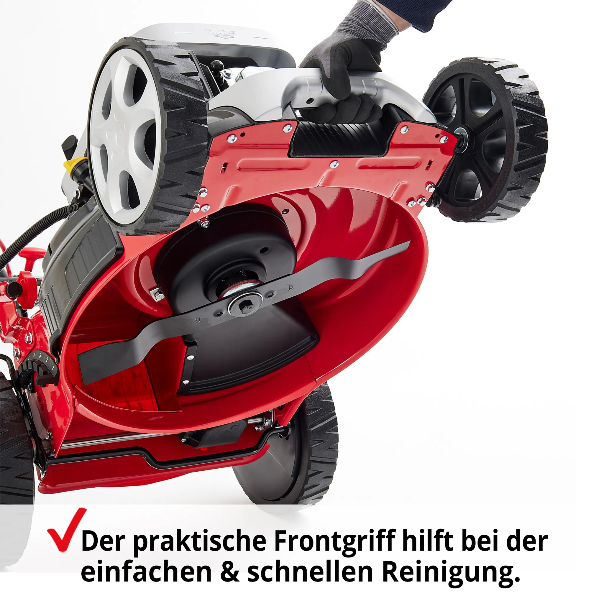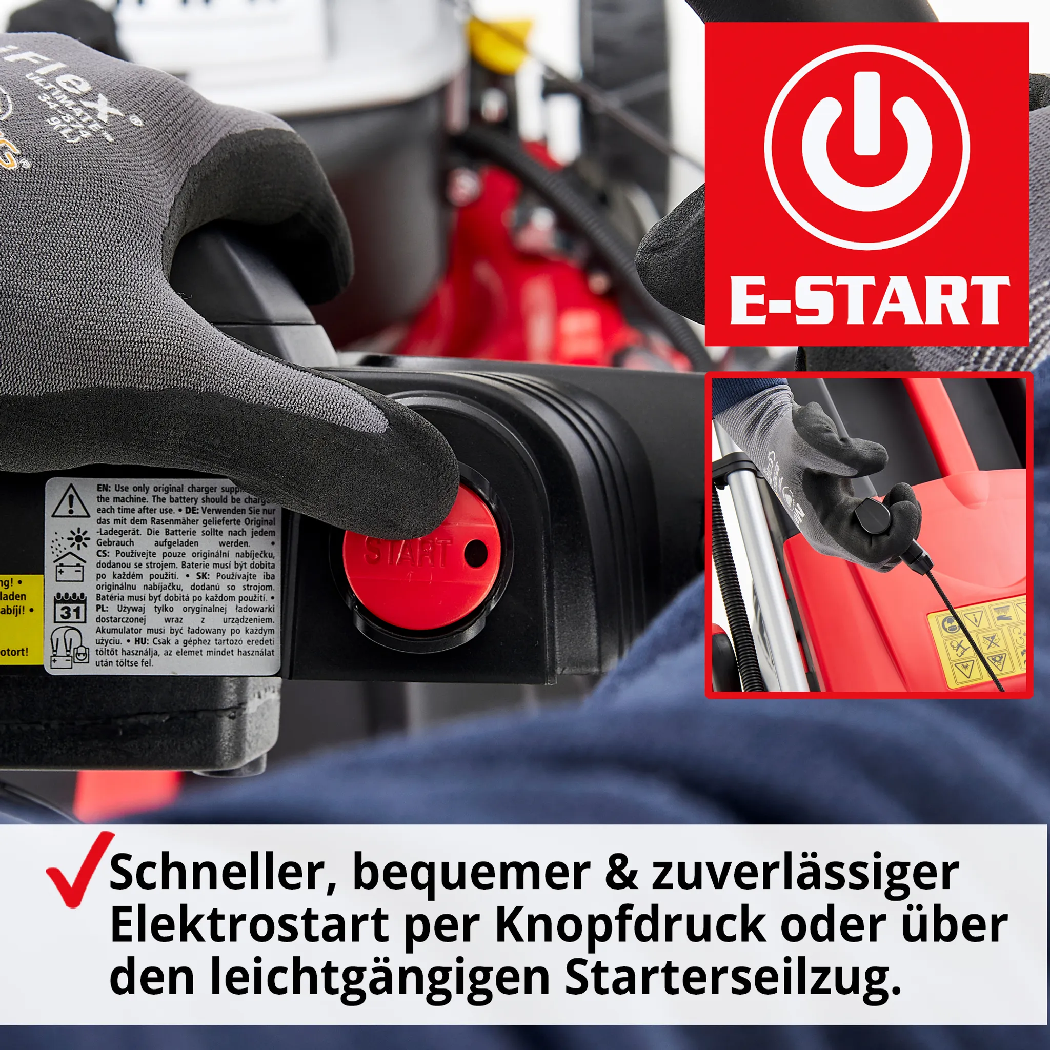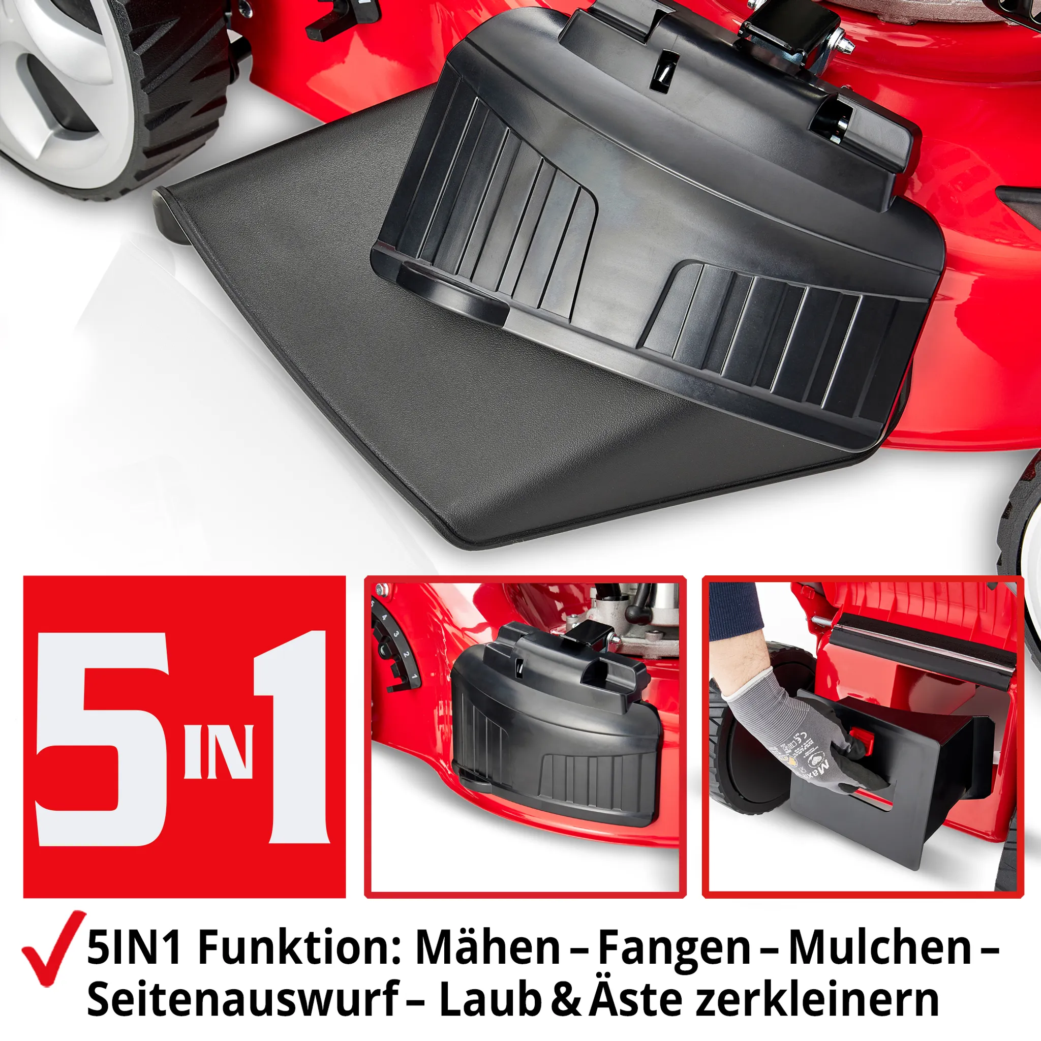 - 5-in-1 Funktion: Mähen, Fangen, Mulchen, Seitenauswurf sowie Laub- und Ästezerkleinern / Elektro-Start / zentrale Höhenverstellung zwischen 25-75 mm