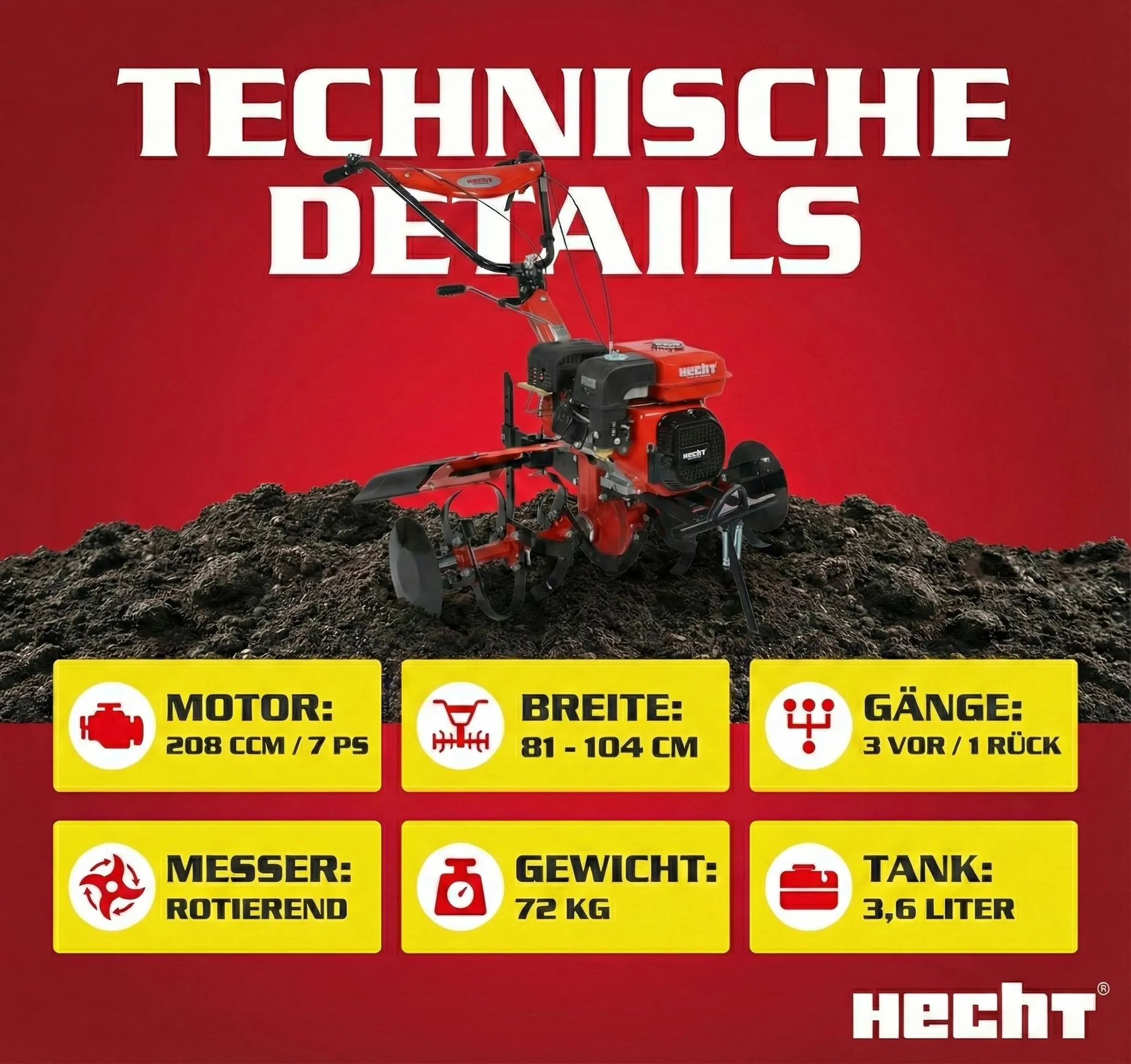 Das HECHT 7100 Set bietet Ihnen eine leistungsstarke Gartenhacke zum Kultivieren und Pflügen, einen robusten Anhänger sowie einen praktischen Radsatz für eine vielseitige Verwendung. Diese Kombination ist ideal für den Einsatz im Garten und erleichtert zahlreiche Aufgaben dank ihrer kraftvollen Leistung und hohen Flexibilität.