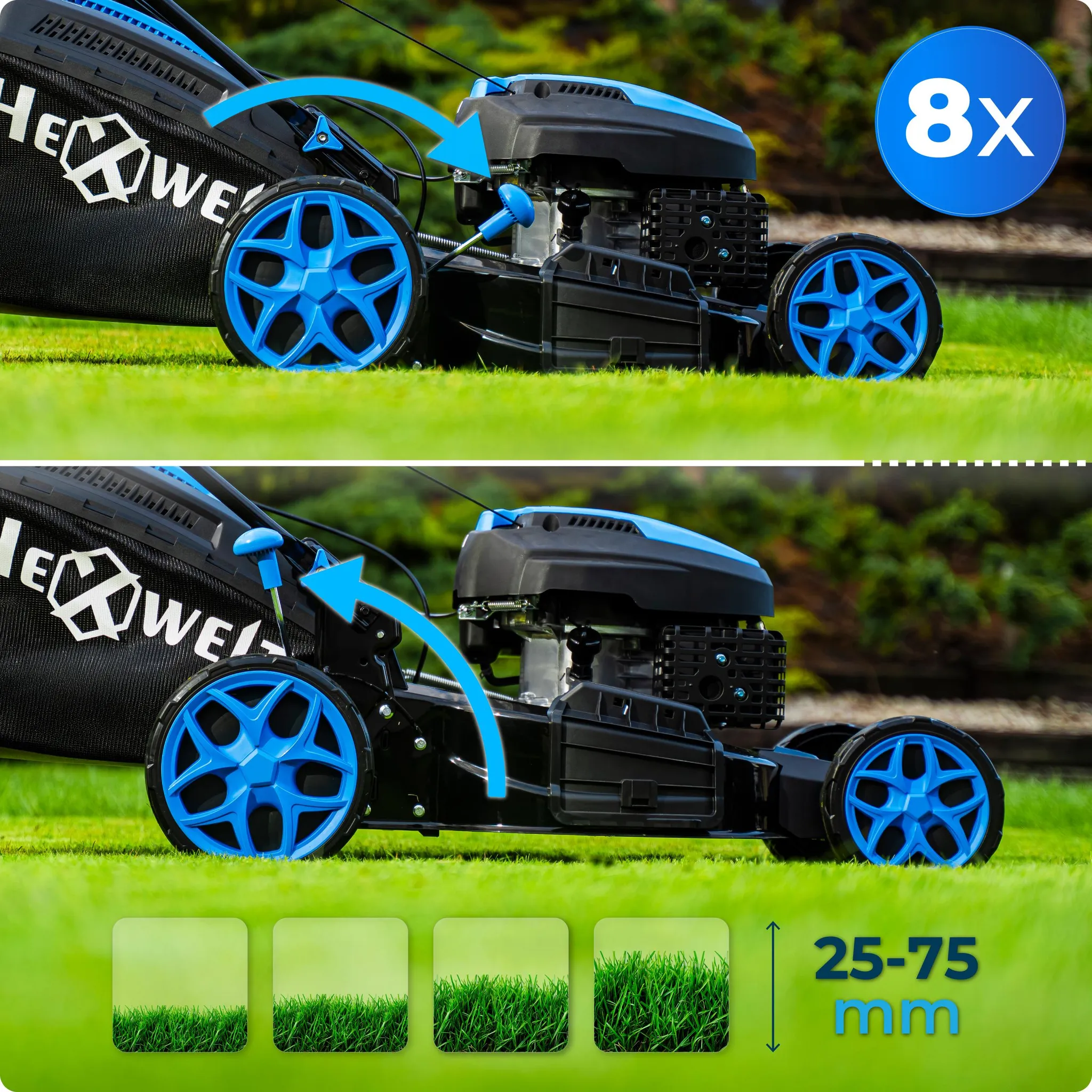 Hexwelt Benzin Rasenmäher mit Antrieb | Schnittbreite 51cm | Mulchfunktion | 60L | 3,8 kW Benzinmäher | 8 Stufen (25-75mm) | ultraleicht, kompakt |