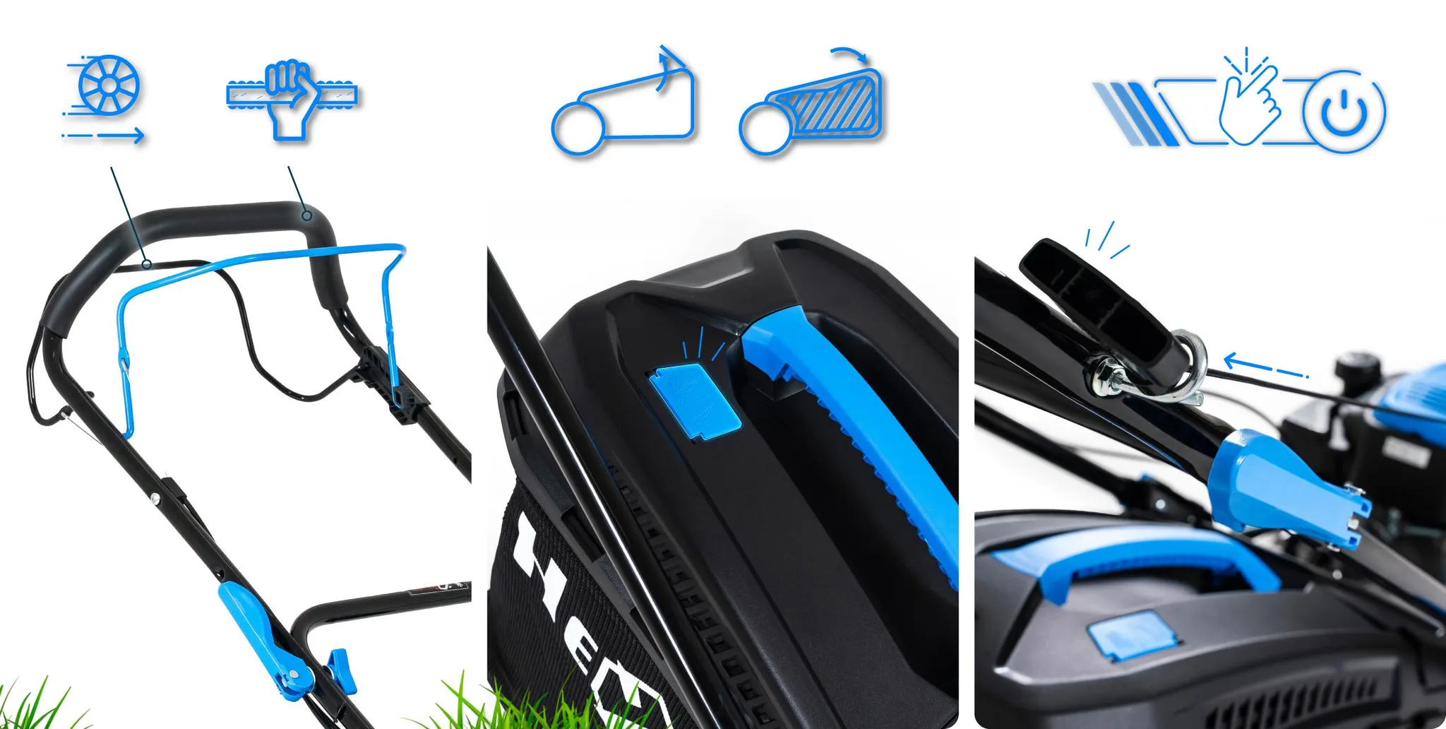 – Antrieb: Das integrierte Antriebssystem erleichtert die Arbeit auf größeren Flächen und Hängen. Die Antriebsgeschwindigkeit beträgt bei jedem Mäher 3,6 km/h und sorgt für reibungsloses und effizientes Arbeiten.