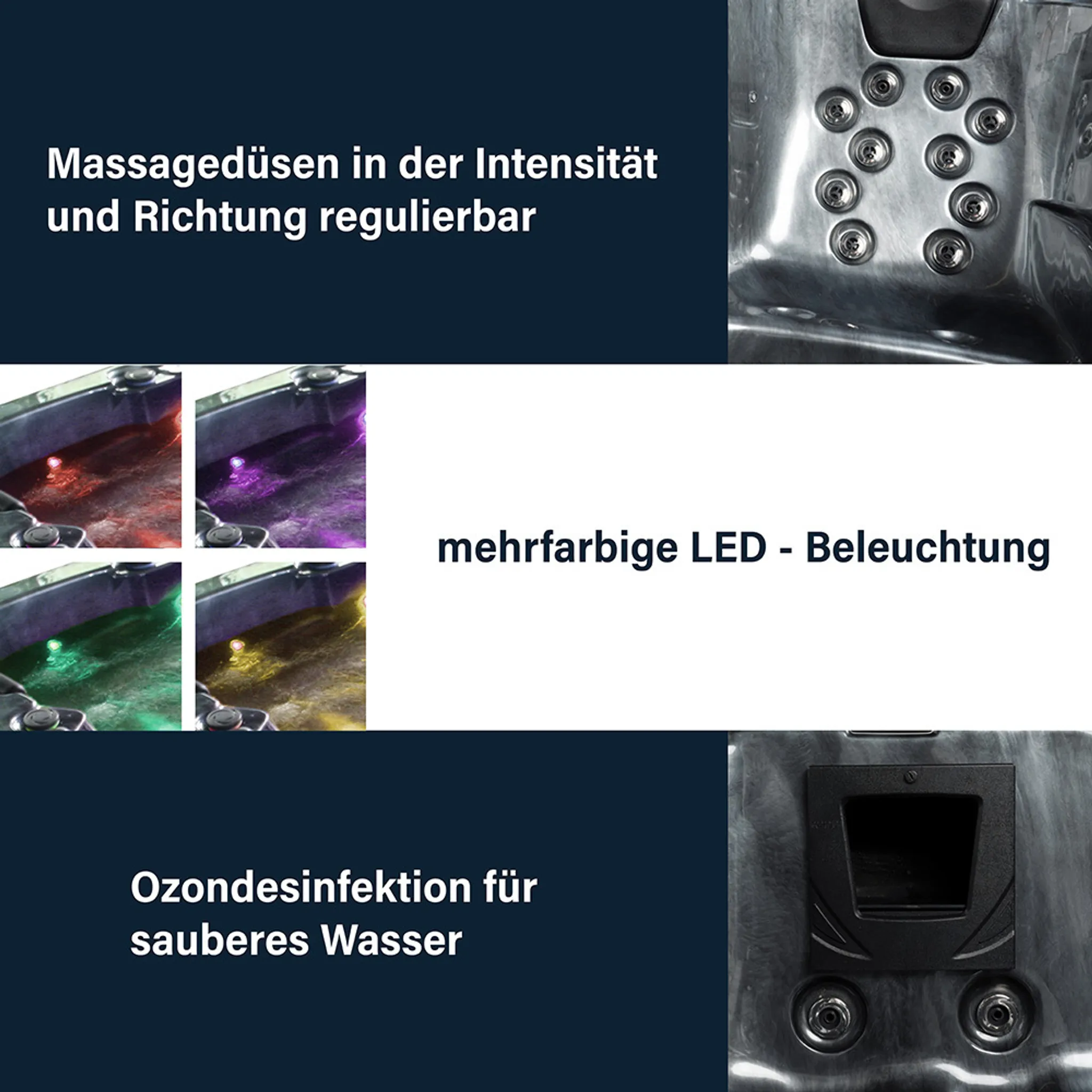 Trotz seiner kompakten Maße passt der BLACK MARBLE fast überall hin und ist somit ideal für unterschiedlichste Einsatzorte. Für eine stimmungsvolle Atmosphäre sorgen neun integrierte LED-Lichtquellen mit Farbwechsel, die Ihren Wellnessbereich in sanftes Licht tauchen. Drei ergonomisch geformte Kopfstützen erhöhen den Sitzkomfort und laden zum entspannten Verweilen ein. Alle Funktionen – von der Temperaturregelung über die Massageintensität bis hin zur Beleuchtung – steuern Sie bequem über das benutzerfreundliche Bedienfeld direkt am Pool. Die leistungsstarke Pumpe ist zweistufig einstellbar und sorgt für kraftvolle Wasserbewegungen. Insektenschutz und ein hochwertiges Filtersystem sind bereits im Lieferumfang enthalten.