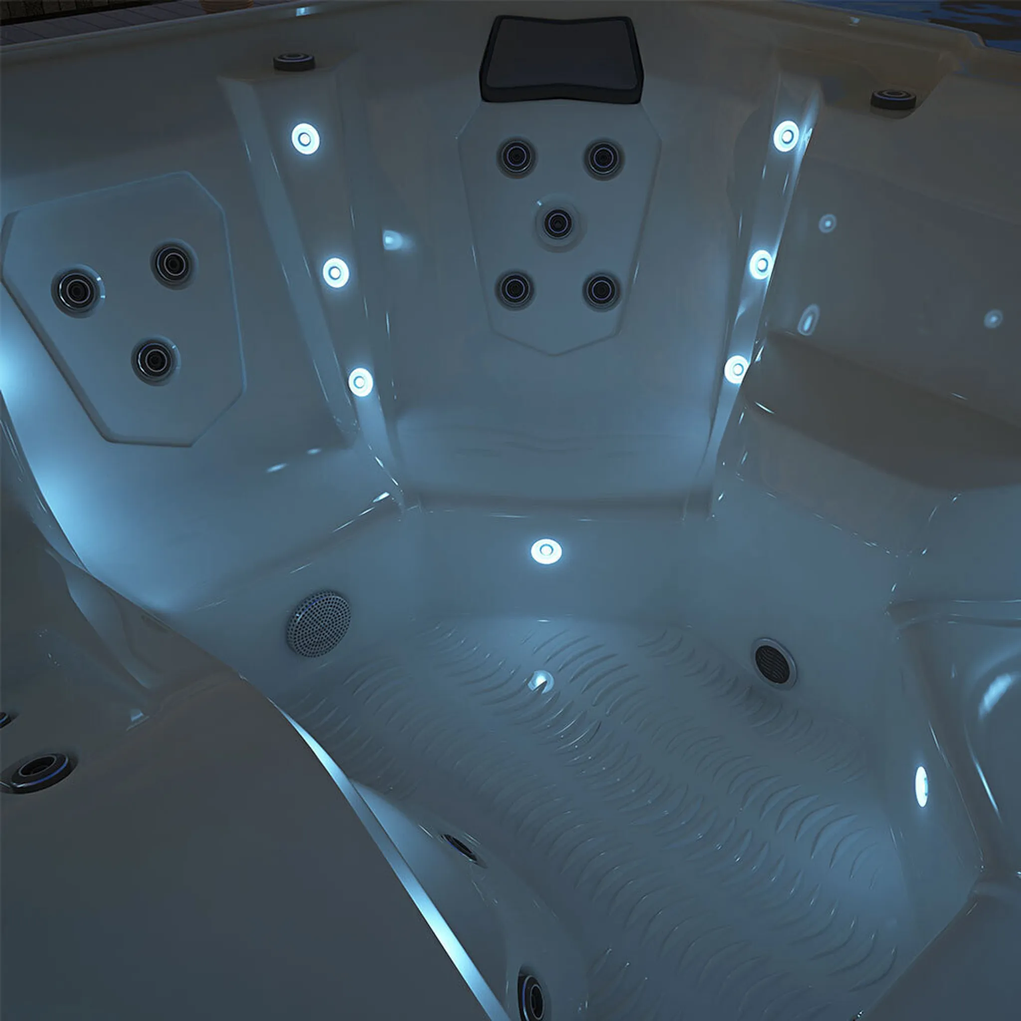 Besonders abends verzaubert der STREAM BIG PURE mit den vier äußeren LED-Lichtstreifen an jeder Kante. Das sanfte Licht erhellt die Umgebung um den Whirlpool, während die LED-Lichter im Boden und an den Innenwänden für ein gemütliches Ambiente sorgen. Nach einem langen Tag lässt du dich von den 34 Massagedüsen verwöhnen, die komfortabel über das Bedienfeld gesteuert werden können. In verschiedenen Liege – und Sitzpositionen kannst du abschalten, während deine Muskeln entspannen und Stress abgebaut wird. Die integrierte Heizfunktion erwärmt das Wasser genau nach deinen Wünschen auf bis zu 40 °C. Der Whirlpool STREAM BIG PURE bietet Raum für Entspannung für bis zu 5 Personen.