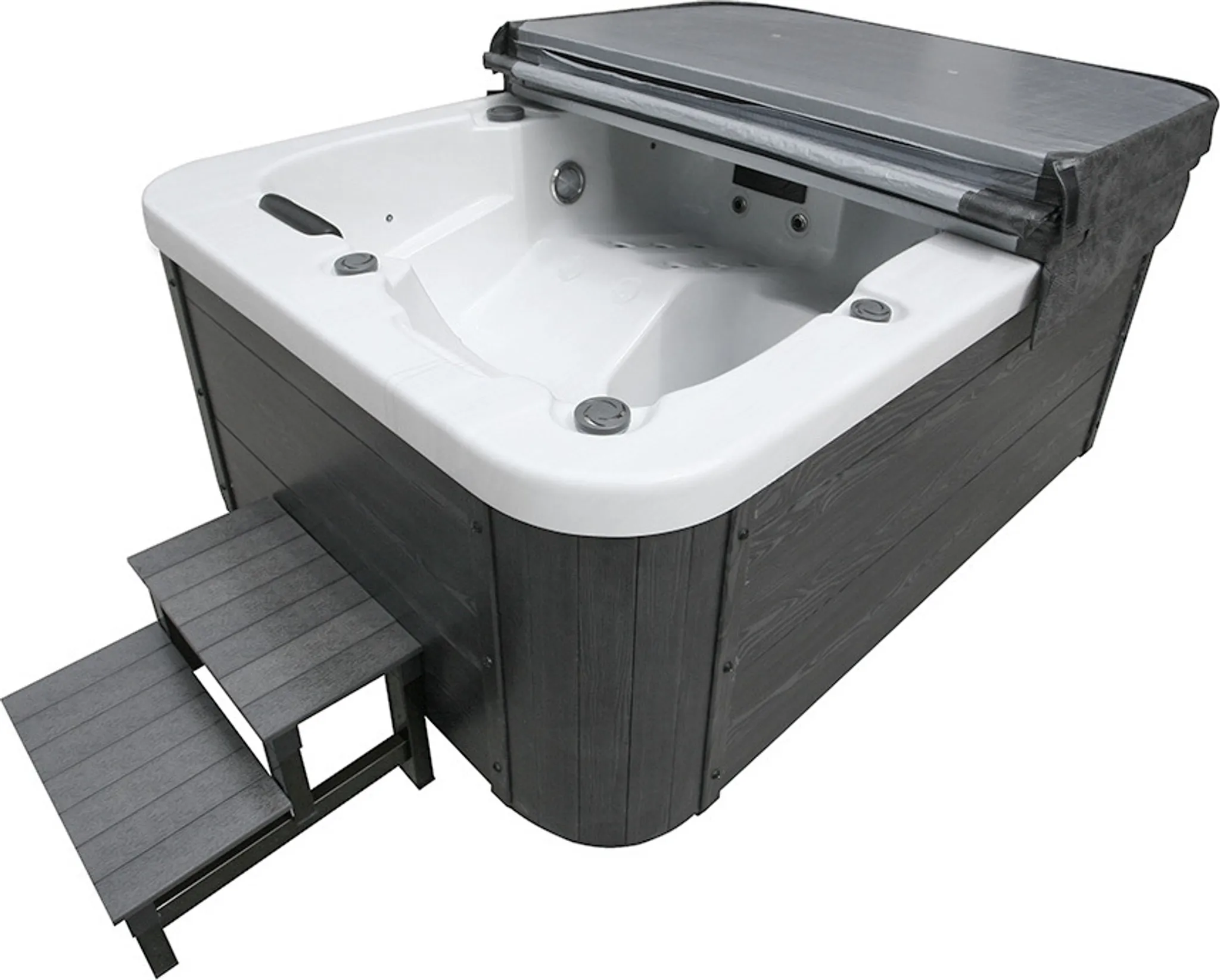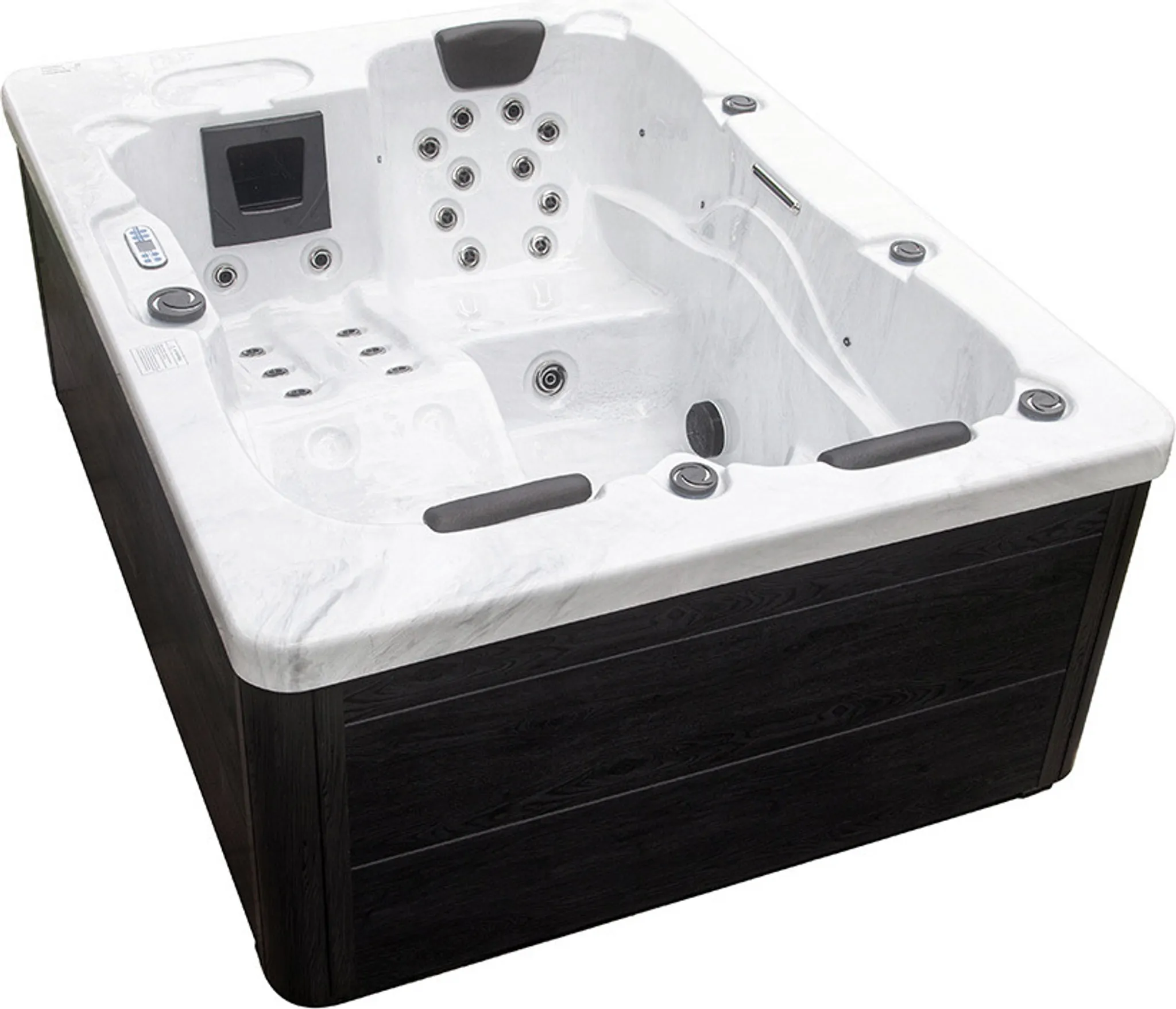 Der WHITE MARBLE Whirlpool bringt dir Entspannung genau dorthin, wo du sie brauchst – in den Garten, auf die Terrasse oder in den Wintergarten. Mit 27 kräftigen, individuell einstellbaren Düsen genießt du eine intensive Massage genau nach deinem Geschmack. Die schicke Marmoroptik der Wanne und die wetterfeste WPC-Verkleidung in Dunkelgrau machen den Pool nicht nur pflegeleicht, sondern auch zum echten Hingucker. Dank kompakter Größe passt er fast überall hin. Für stimmungsvolle Abende sorgen neun integrierte Lichtquellen mit Farbwechsel. Drei bequeme Kopfstützen machen das Sitzen oder Liegen noch angenehmer. Über das Bedienfeld steuerst du alles bequem direkt am Pool – von der Temperatur über die Massagedüsen bis zur Beleuchtung. Die leistungsstarke Pumpe lässt sich zweistufig einstellen. Insektenschutz und ein passendes Filtersystem sind bereits dabei. Der WHITE MARBLE wird als Komplettset inklusive Treppe und passender Thermoabdeckung geliefert – alles drin, sofort startklar. Die hochwertige Ausstattung, einfache Bedienung und durchdachten Details machen ihn zur perfekten Wahl für dein privates Spa-Erlebnis.