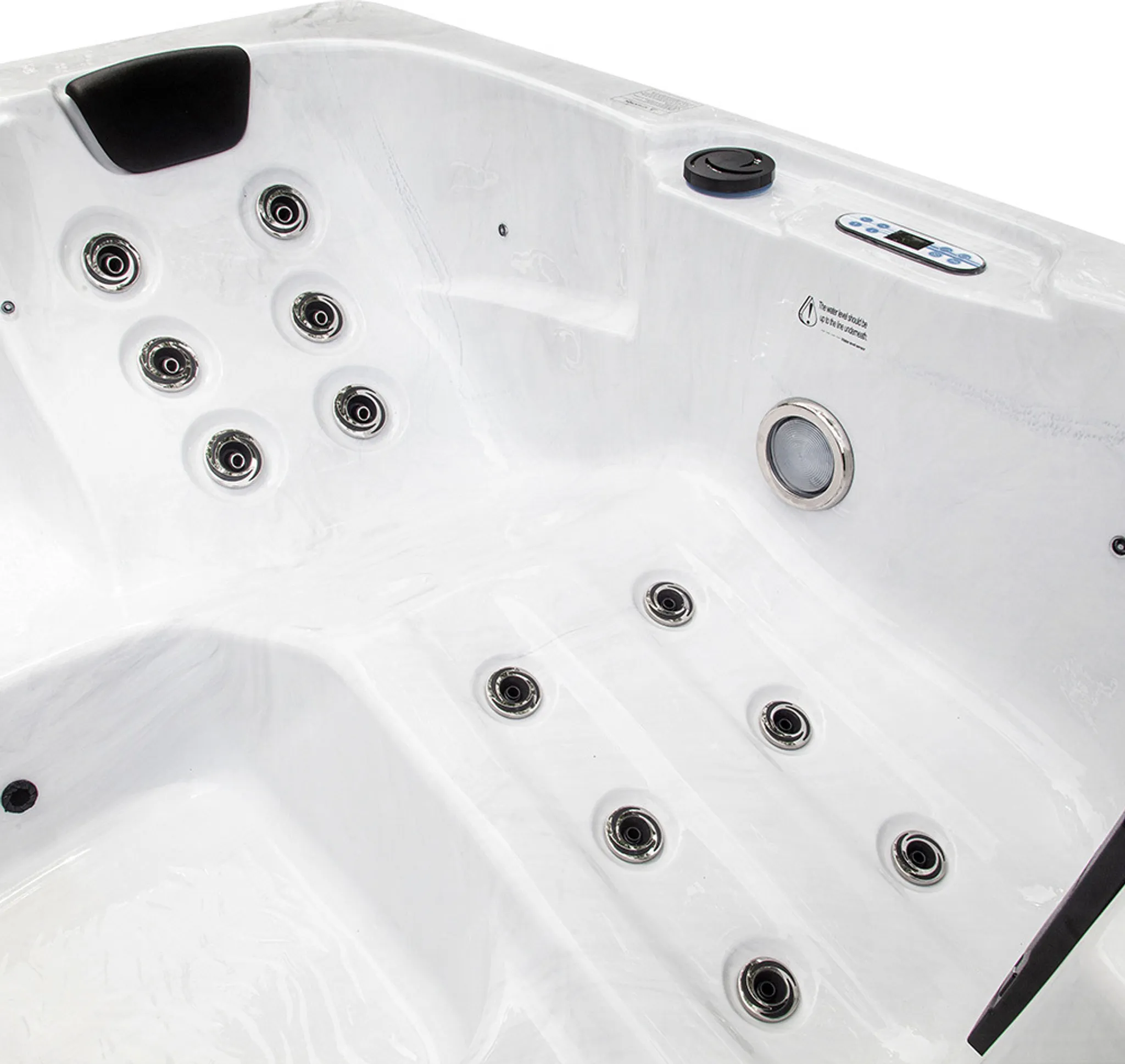 Der WHITE MARBLE Whirlpool bringt dir Entspannung genau dorthin, wo du sie brauchst – in den Garten, auf die Terrasse oder in den Wintergarten. Mit 27 kräftigen, individuell einstellbaren Düsen genießt du eine intensive Massage genau nach deinem Geschmack. Die schicke Marmoroptik der Wanne und die wetterfeste WPC-Verkleidung in Dunkelgrau machen den Pool nicht nur pflegeleicht, sondern auch zum echten Hingucker. Dank kompakter Größe passt er fast überall hin. Für stimmungsvolle Abende sorgen neun integrierte Lichtquellen mit Farbwechsel. Drei bequeme Kopfstützen machen das Sitzen oder Liegen noch angenehmer. Über das Bedienfeld steuerst du alles bequem direkt am Pool – von der Temperatur über die Massagedüsen bis zur Beleuchtung. Die leistungsstarke Pumpe lässt sich zweistufig einstellen. Insektenschutz und ein passendes Filtersystem sind bereits dabei.