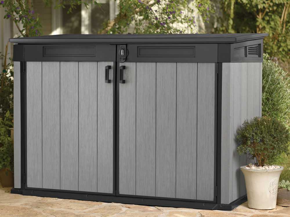 Dieser Außenschrank ist ideal für verschiedene Verwendungszwecke: die Aufbewahrung von Gartenmöbelkissen, Grills oder Gartengeräten, Fahrrädern und sogar als Stauraum von drei 240-Liter-Mülltonnen.