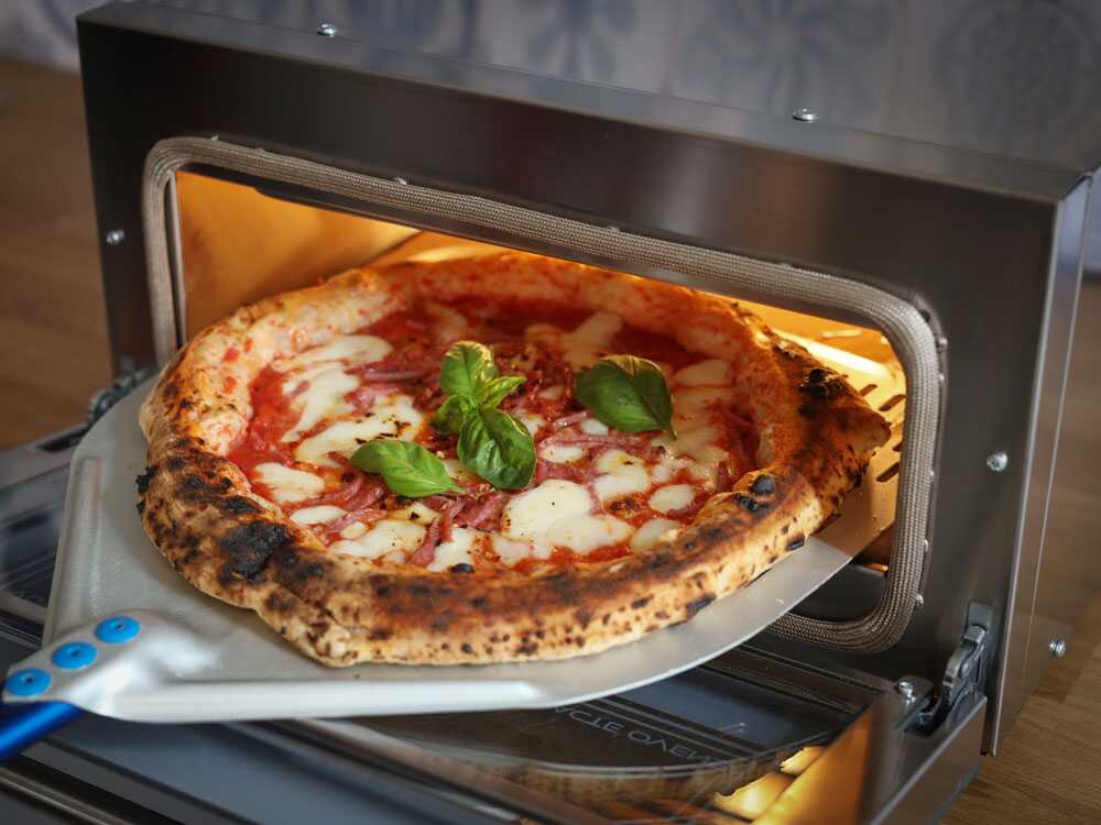 Mit seinen Außenmaßen von 45 x 59 x 29 cm ist er für verschiedene Räumlichkeiten geeignet, während der Innenraum eine Backfläche von 35 x 40 x 9,5 cm bietet, die für Pizzen unterschiedlicher Größe ausgelegt ist. Die dreifach verglaste Tür gewährleistet eine klare Sicht auf den Backvorgang.
