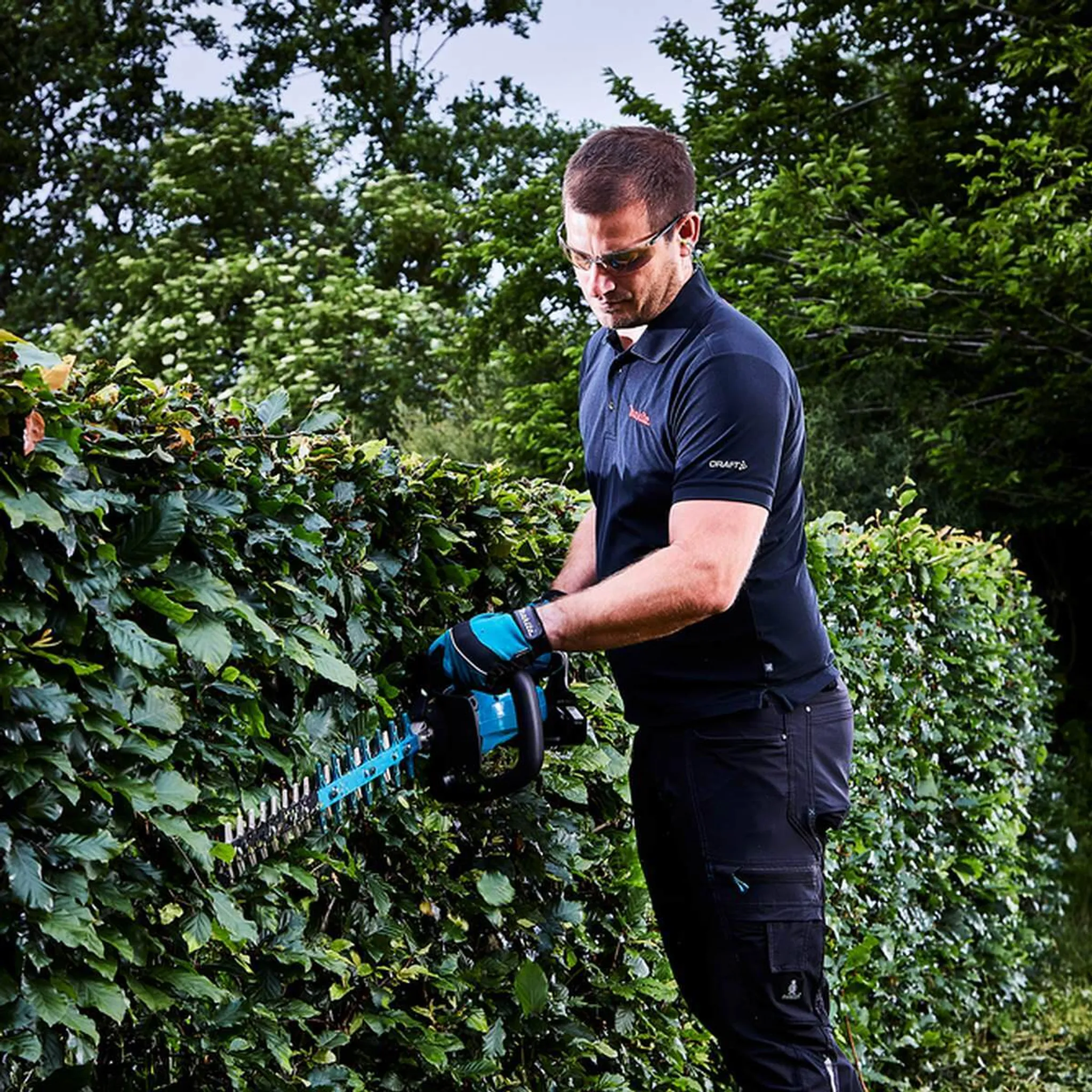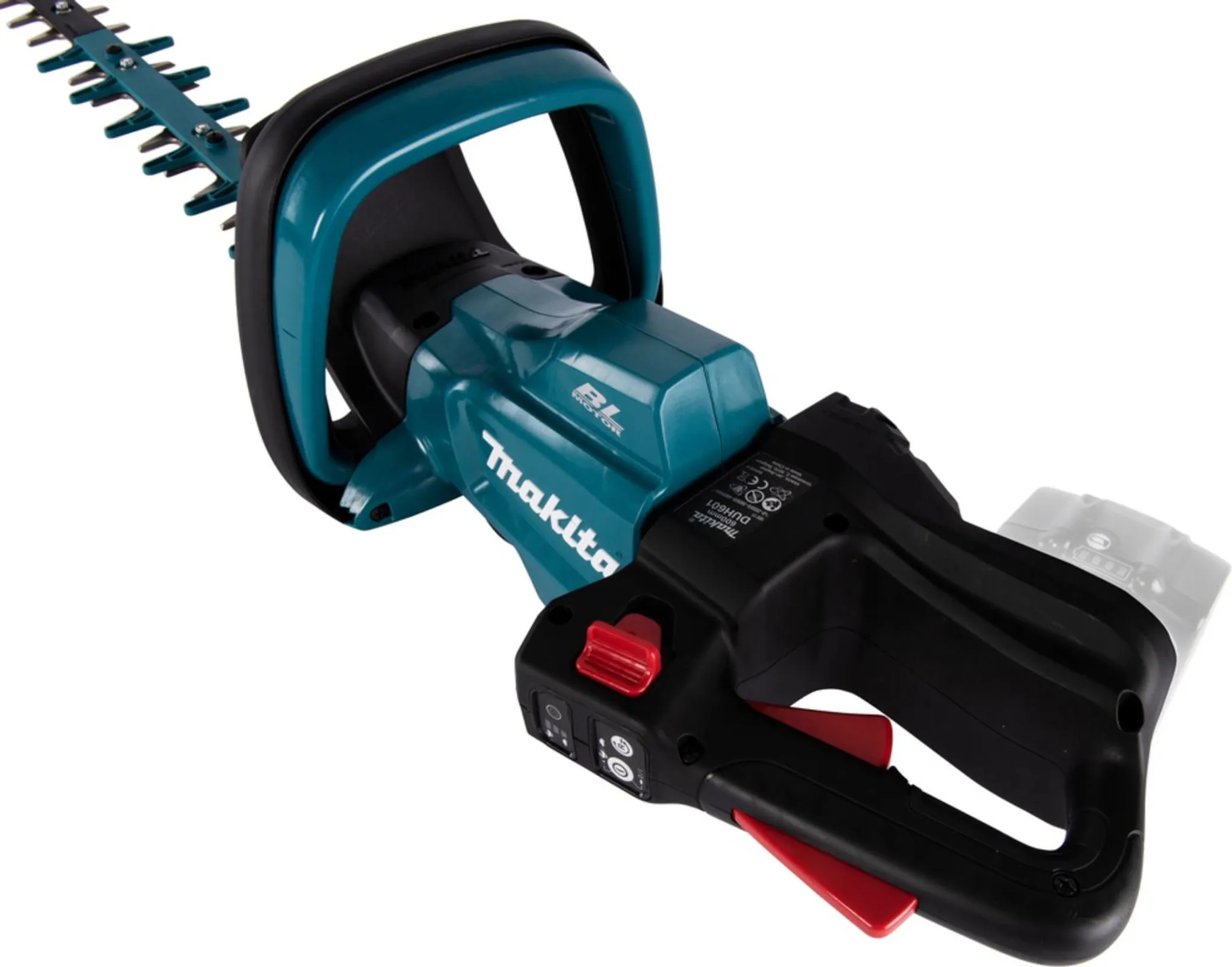 Die neue Makita DUH 601 mit neuer Messerzahnform leitet Zweige besser ein. Durch wenig Reibung der Klingen entsteht ein geringer Widerstand, was zu einer besseren Laufzeit und geringen Abnutzung des Materials führt. Der verstellbare Griff mit 5 verschiedenen Positionen ( Arretierung bei 0° sowie 45° und 90° links und rechts ) ermöglichen ein angenehmes Arbeiten in jeder Haltung. Durch eine intelligente Positionierung des Akkus am hinteren Griffende, wird eine gut ausbalancierte Handhabung ermöglicht. Makita verspricht ein kraftvolles und effektives Arbeiten, was einem Benzin-Gerät ähnelt. Durch das geringe Gewicht des Gerätes wird das Arbeiten kräfteschonend und eindeutig effektiver. Mit einer hohen und elektronisch regelbaren Hubzahl mit 3 Stufen, sind schnellere und einstellbare Schnitte möglich. Der bürstenlose Motor sorgt für mehr Ausdauer, längere Lebensdauer und eine kompaktere Bauweise. Es besitzt eine Konstantelektronik, wodurch die Drehzahl dem Widerstand angepasst wird. Das rostfreie Messer mit beidseitig geschärften Kanten lässt sich einfach auswechseln.