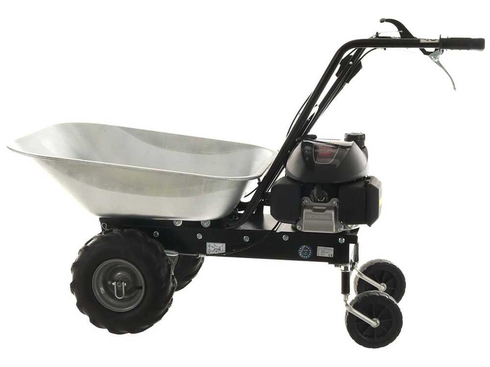 Diese Motorschubkarre mit Benzinmotor verbindet Leistung mit Nutzungskomfort. Die großen pneumatischen Räder sorgen für einen tadellosen Transport sogar auf unebenen Gelände oder bei Steigungen. Die hinteren Schwenkräder erlauben die Bewegung auch auf schmalen Wegen und die automatische Parkbremse gewährleistet die Sicherheit des ganzen Systems.