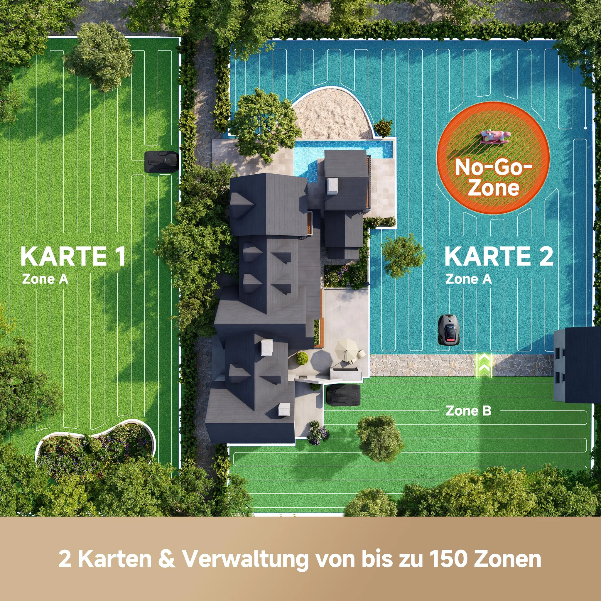 Fortschrittliche KI erkennt über 300 Hindernisse – von Gartenmöbeln bis zu kleinen Objekten – und weicht ihnen sicher aus, für mehr Schutz von Familie und Haustieren.