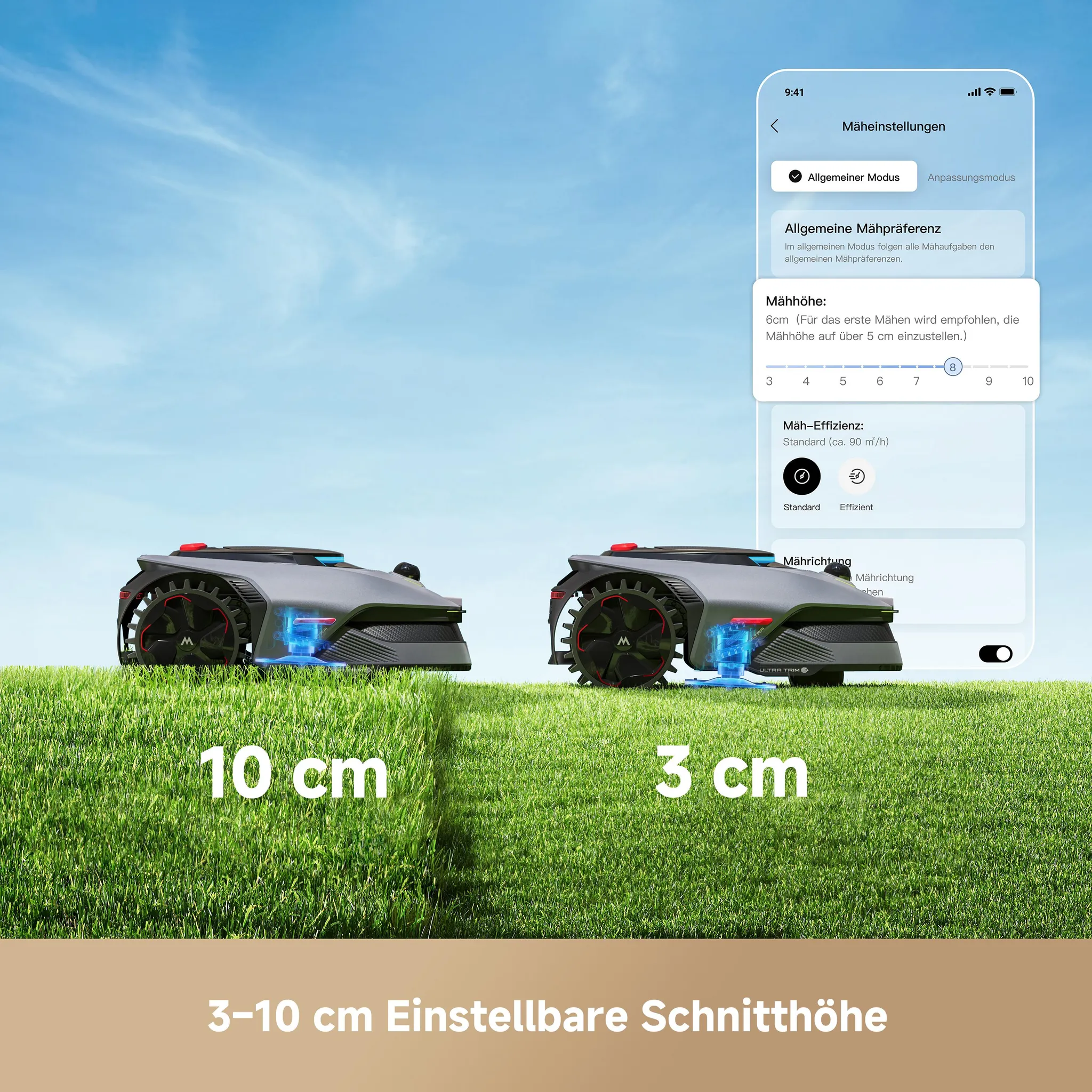 Die bewegliche Messerscheibe mäht bis auf 5 cm an Wänden, Zäunen und Beeträndern heran. Durch aktives Randfahren entstehen saubere Übergänge ohne ungemähte Stellen.