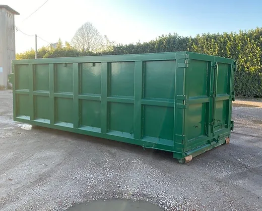 Ein grüner, offener Container mit hinteren Doppelflügeltüren, perfekt für die Entsorgung sperriger Abfälle.