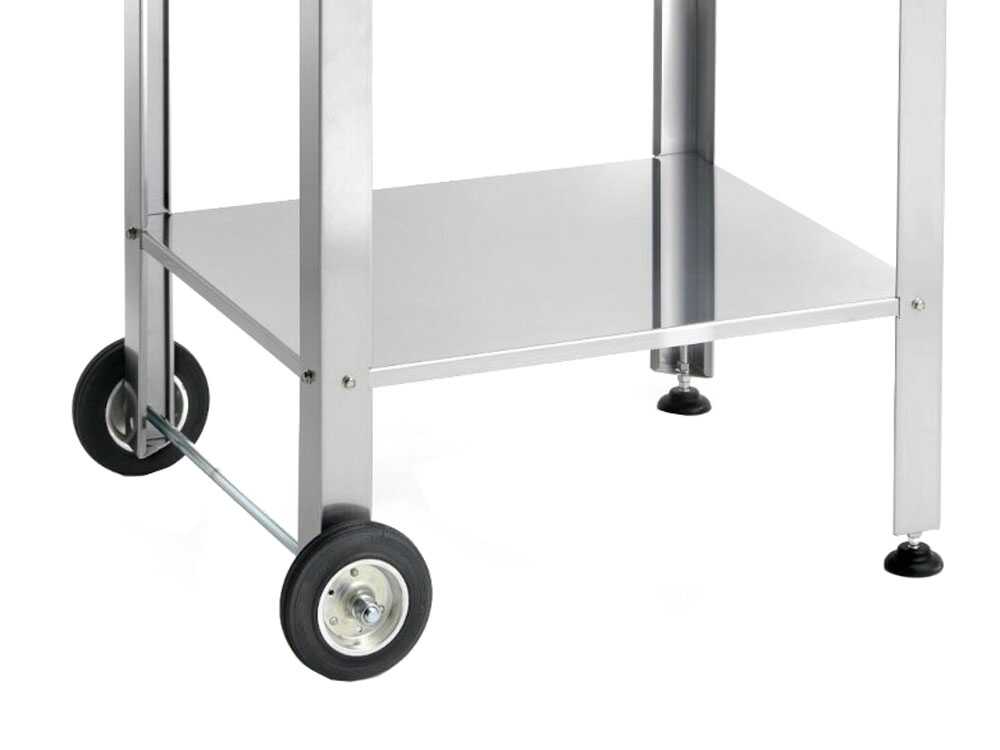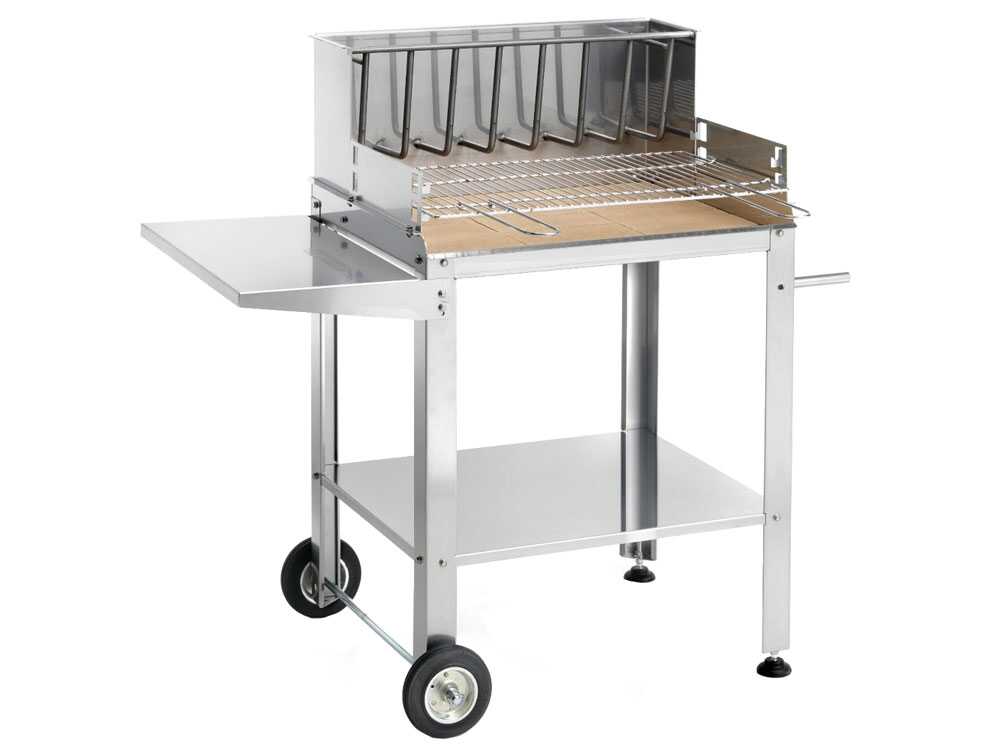 Das Design ist mit seitlichen Windschutzblenden aus Edelstahl ausgestattet, die den Garvorgang vor Wind schützen und so die Wärmeeffizienz verbessern. Die klappbare Seitenablage bietet eine praktische Abstellfläche, während der fahrbare Wagen mit Rädern das Umstellen auch auf unebenen Flächen erleichtert.