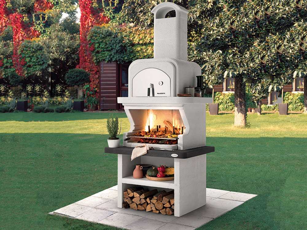 Bei dem Grill Palazzetti Balos handelt es sich um einen Kombi-Grill, der mit einem Holzkohlegrill und an der Seite mit einem Holzbackofen ausgestattet ist.