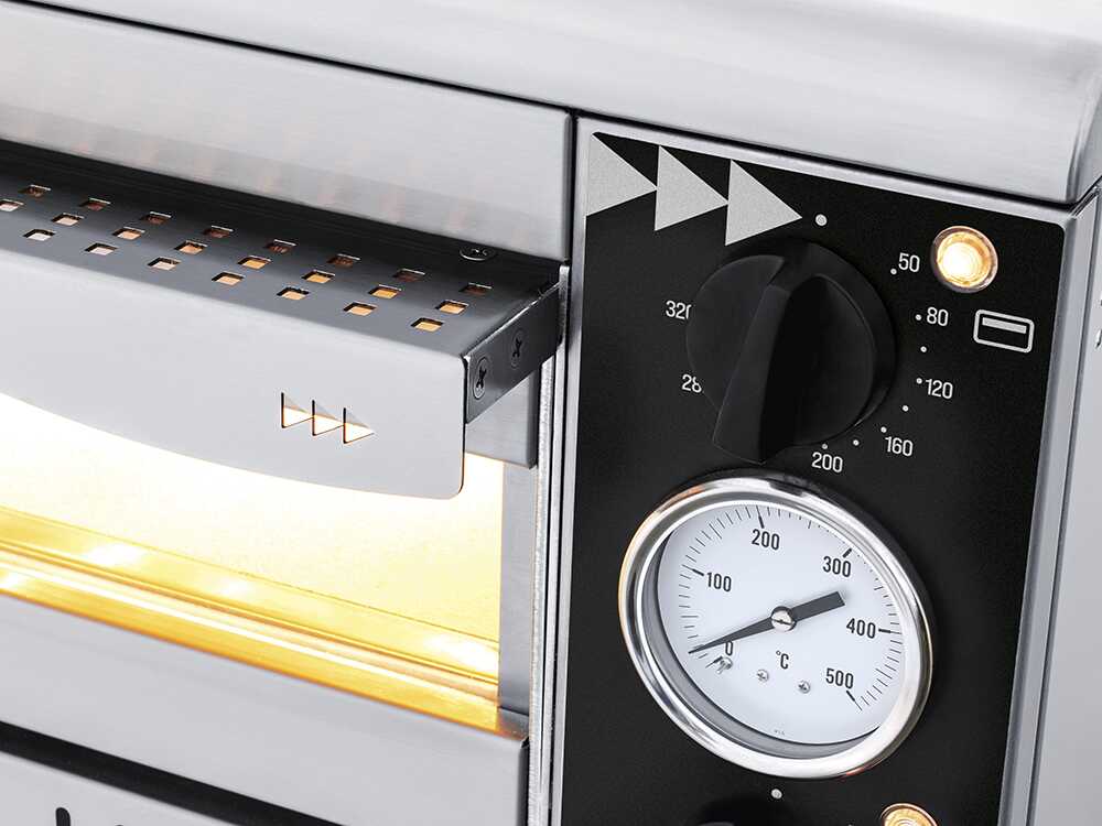 - Doppelter Thermostat für Ober- und Unterhitze: Jede Kammer verfügt über zwei separat gesteuerte Heizelemente für eine präzise Regelung der Ober- und Unterhitze. Dadurch kann der Backvorgang an verschiedene Teige angepasst werden.